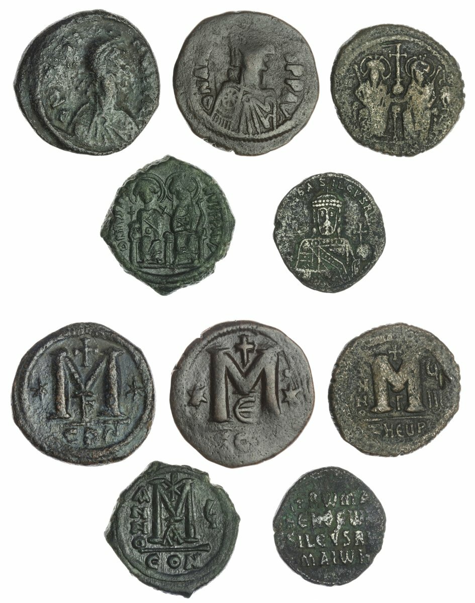 Byzantine Empire, Anastasius I  (491-518), Ae Follis, Constantiople, Anastasius right, diademed, draped and cuirassed, star on shoulder, rev. large M between two stars, pellets above stars, cross above M, Officina E under, CON in exergue, 16.38 g (S 20), weak in parts as common for type, Fine with a pleasing, velvety surface; also Justin I (518-27), Ae Follis, Constantiople, 17.13 g (S 62), about Fine; also Justin II (565-78), Ae Follis, Constantinople, officina G, 15.97 g (S 379), Very Fine, rough edges, nice green toning; also same, Ae Follis, Theoupolis (Antioch), regnal year 9(5 A.D.), officina G, 12.21 g (S 379), Very Good; +2. (5)