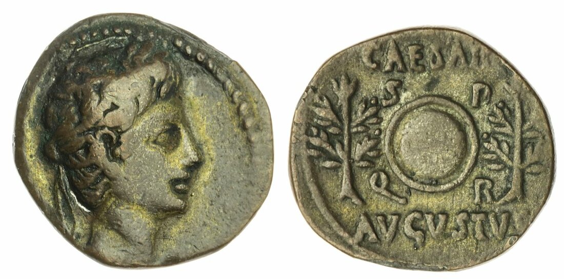 Augustus (27 BC - AD 14), Limes Denarius, 5h, Colonia Caesaraugusta, struck 19-18 BC, laureate head right, rev. CAESAR AVGVSTVS above and below trees, in centre, shield, S P Q R around (cf. RIC 52; cf. RCV 1620), in base metal, almost very fine