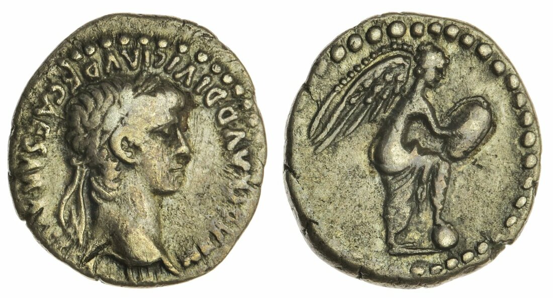 Cappadocia, Caesarea-Eusebia, Nero (54-68) AR Hemidrachm, 12h, struck AD 58-60, NERO CLAVD DIVI CLAVD F CAESAR AVG GERMANI, laureate head right, rev. Nike standing right, right foot on globe, inscribing shield set on knee (RPC I 3646; Sydenham, Caesarea 83), a really good fine