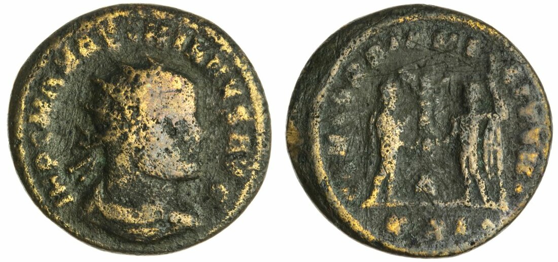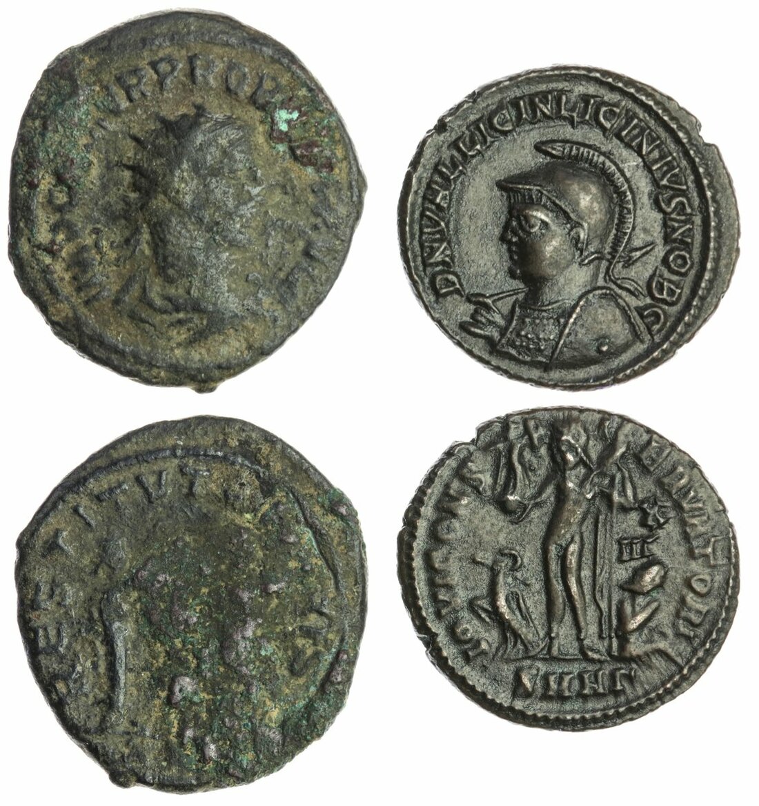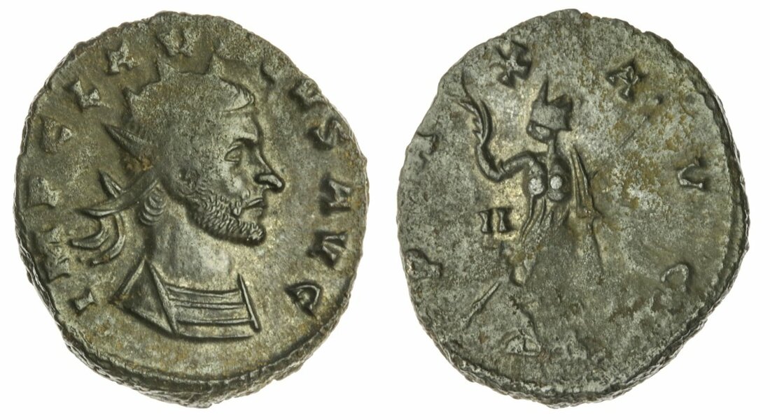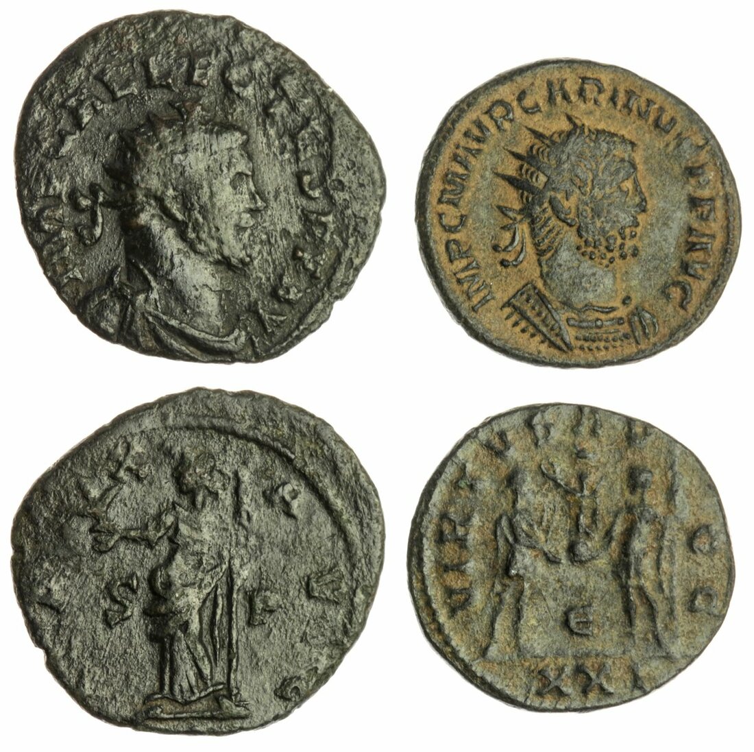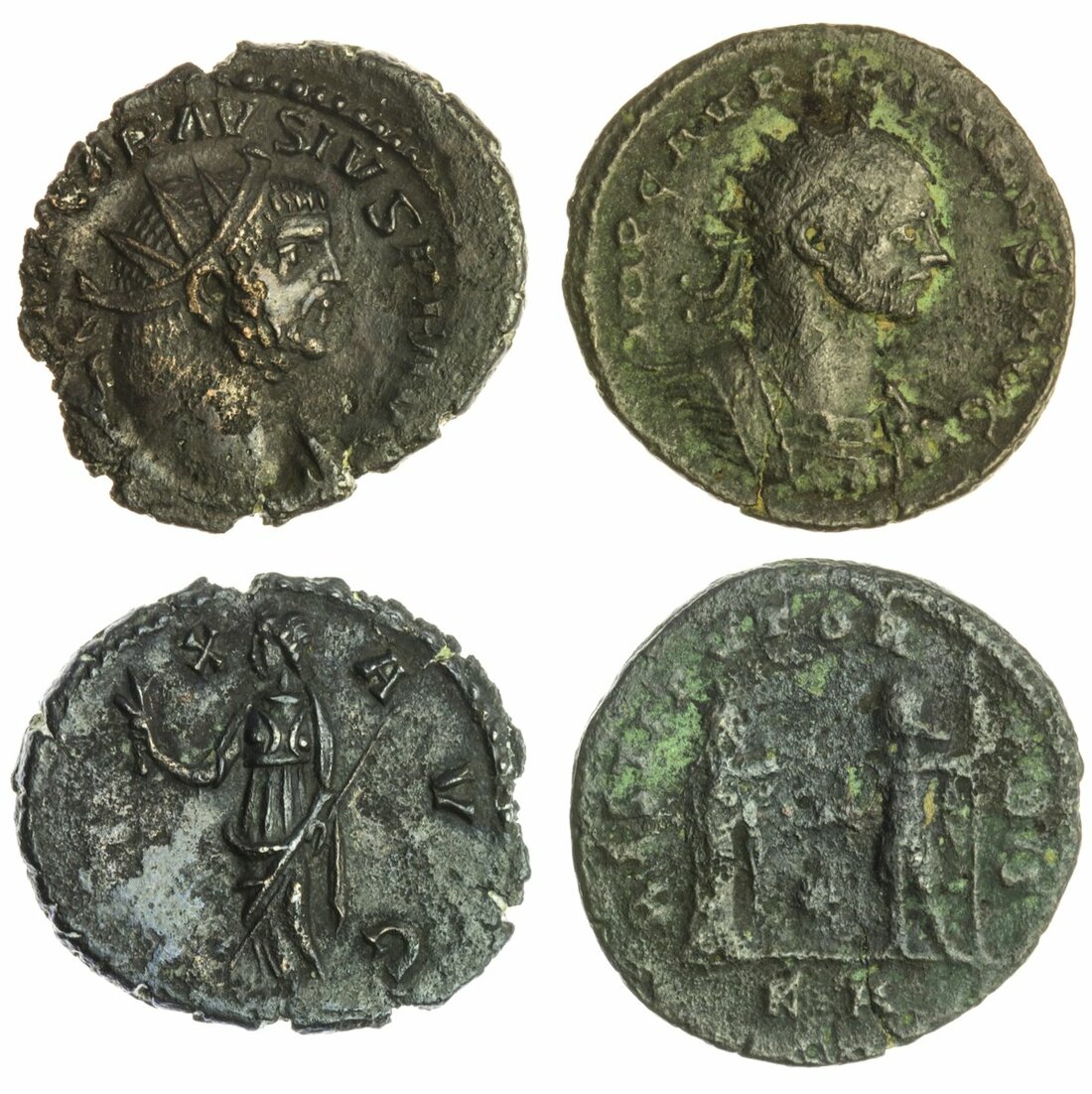 Third Century AE Antoninianii (31), including, Valerian (2); Gallienus; another, Claudius II Gothicus, Quintillus (RIC 33); Aurelian, RESTITVTOR ORBIS (2), one of Cyzicus; Tacitus, rev. PAX PVBLICA (RIC 45); Probus (3), one struck in Antioch; Carinus; Carus; also, Numerian (RIC 243); Diocletian (4); Maximianus Herculeus (5); and Constantius Chlorus (2), generally fine to good very fine, some corroded; additionally, Gallic Empire (3), Postumus, rev. IOVI VICTORI Tetricus I, rev. HILARITAS AVG (RIC 79); and, Victorinus, rev. SALVS AVG (RIC 122), generally very fine; lastly, Britannic Empire (2), Carausius, rev. PAX AVG; lastly, Allectus, PAX AVG, S-P across field (RIC 305), fine to very fine (31)