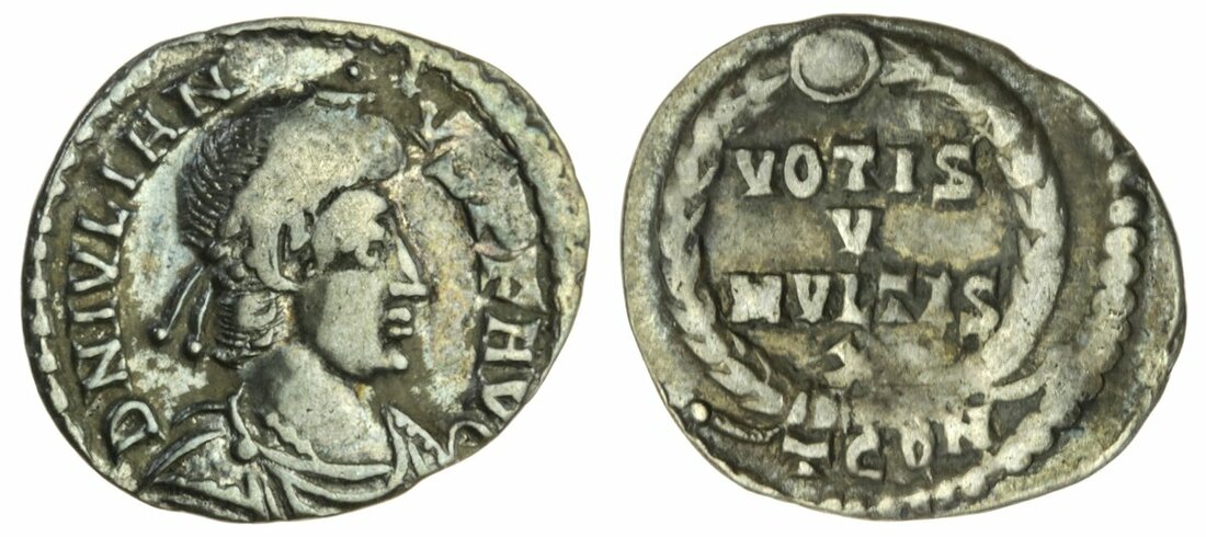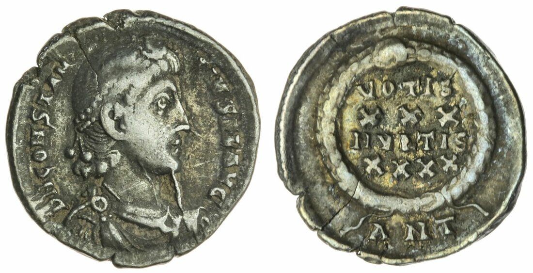 4th Century Silver, AR Siliquae (3), Constantius II Gallus (337-61), 6h, Tricennalia Issue, Antioch, struck AD 347, rev. VOTIS | XXX | MVLTIS XXXX in wreath, ANT below (RIC VIII 108; RSC 342), toned, very fine; also, Julian II, as Augustus (361-63), Arelate, as last, rev. VOTIS | V | MVLTIS X in wreath, TCON below (Bastien 261; RIC 218), toned, good fine; lastly, Valentinian II (375-92), Nicomedia, similar, rev. VOT | X | MVLT | XX in wreath, SMN below, chipped and pierced, otherwise very fine, very rare (3)