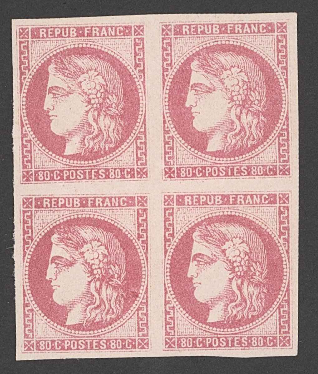 80c. rose, block of four with good margins on all sides, large part original gum, the lower pair unmounted; signed Brun. S.G. 183, £5,200+; Spink Maury 49, €3,750