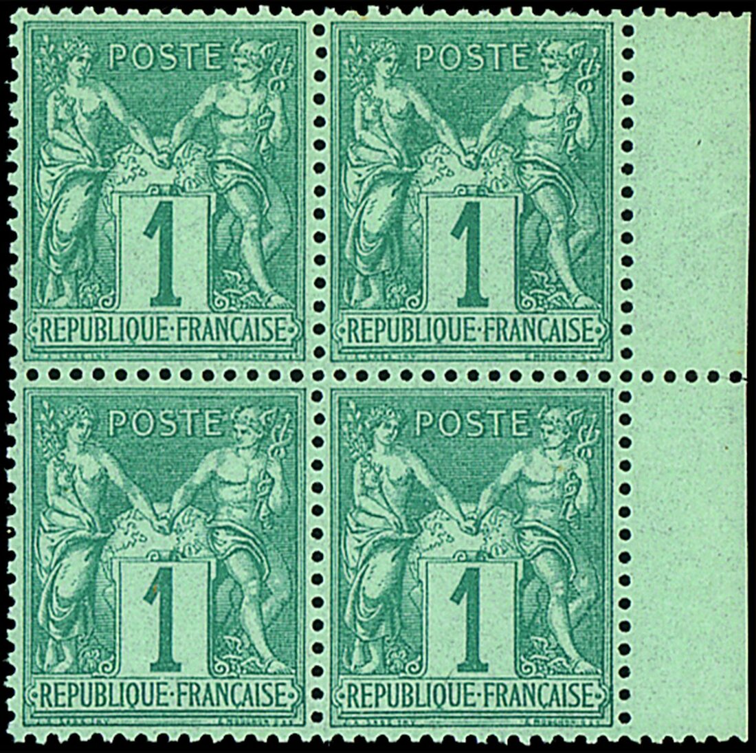 1876-85, Type I, N under B, 1c. green, block of four from the right of the sheet, unmounted mint, well centred, fresh and fine. Signed Calves, La Postale Certificate (2013). Spink Maury 61, €1,225