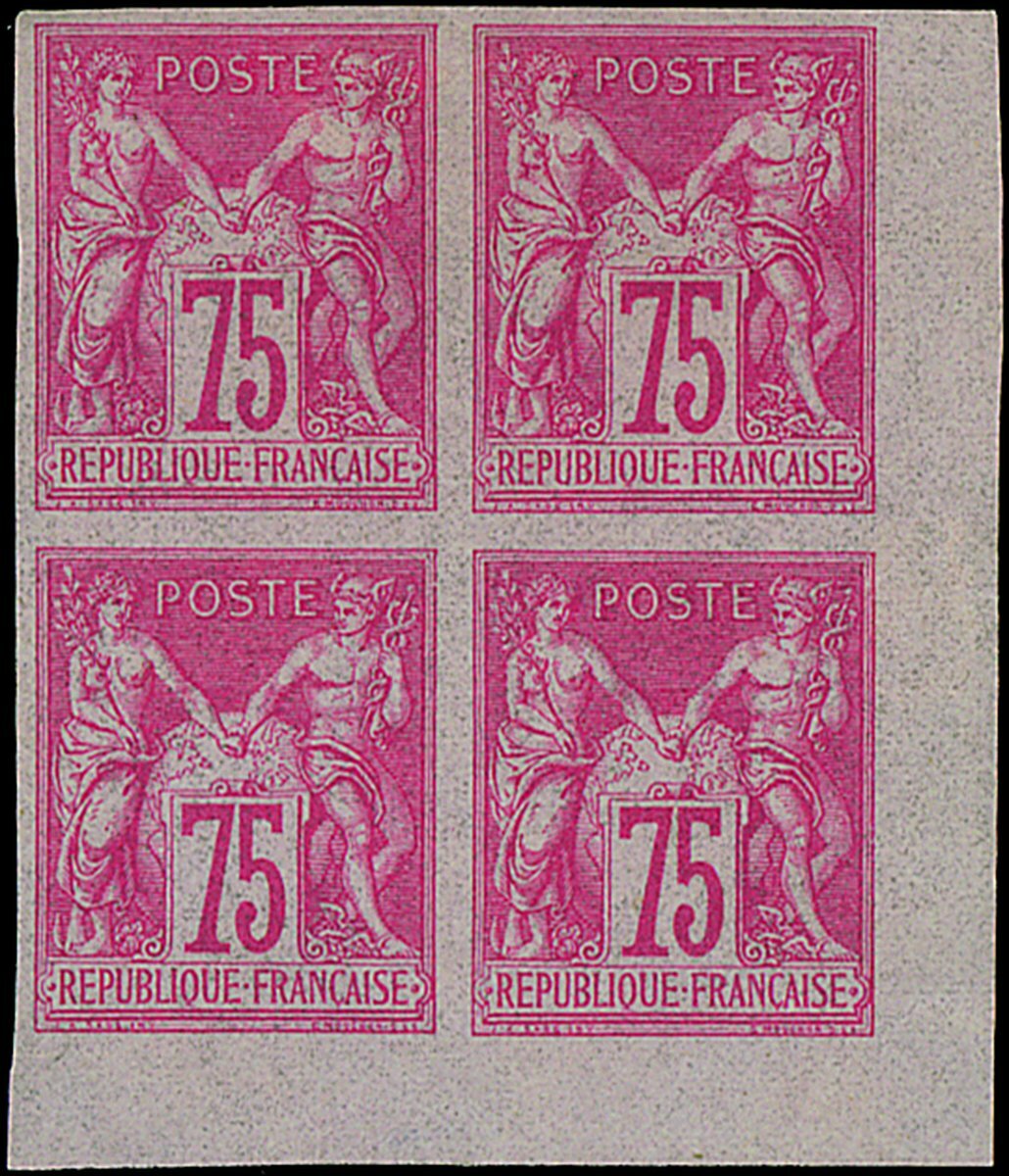 75c. rose, block of four from the lower right corner of the sheet, original gum, the lower pair remaining unmounted mint; fine. La Postale Certificate (2016), Yvert 28