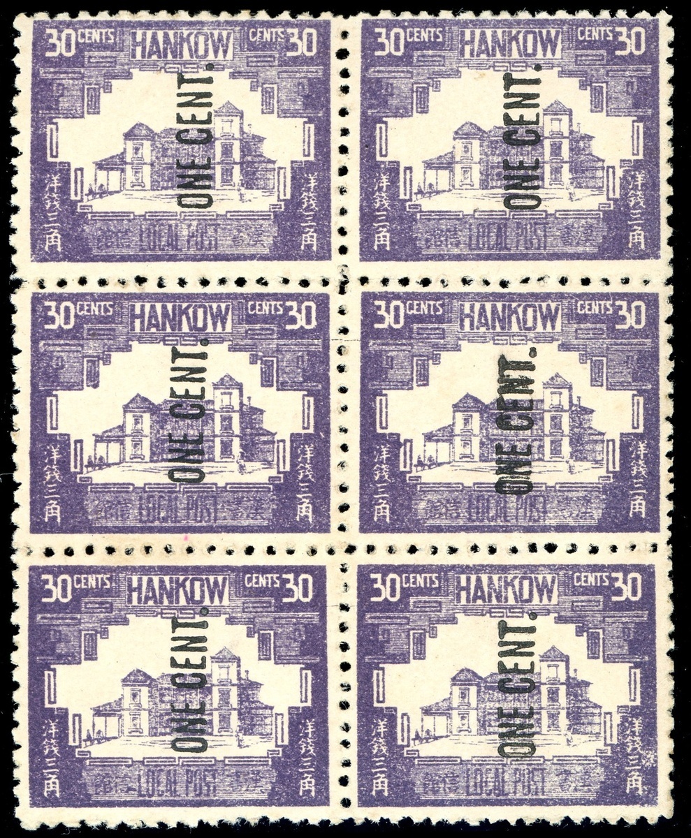 1c. on 30c. slate-purple in a block of six, stone I [54/75], the centre right stamp with variety kiss print double, without gum. Unusual and scarce
