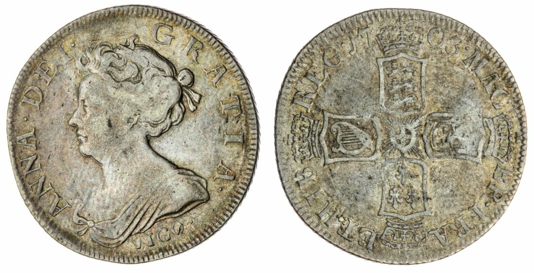The Abramson Collection of English Coins | Anne (1702-1714), Pre-Union, VIGO Shilling, 1703, second bust, six strings, edge obliquely milled, 5.98g, 7h (Bull 1388; ESC 1131; Spink 3583), light tone, about fine