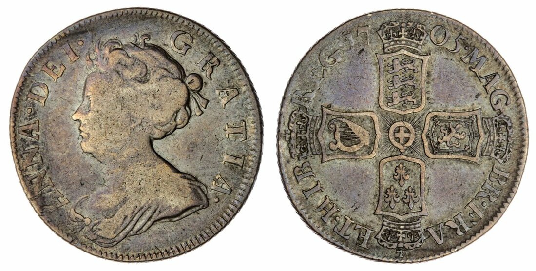 The L'Abbaye Collection | Anne (1702-1714), Pre-Union, Shilling, 1705, second bust, rev. six strings to harp, angles plain, edge obliquely milled, 5.89g, 7h (Bull 1391 [R2]; ESC 1134 [R3]; Pywell-Phillips -; Spink 3587), rubbed and probably lightly cleaned albeit now retoned, fair / a bold fine, very rare