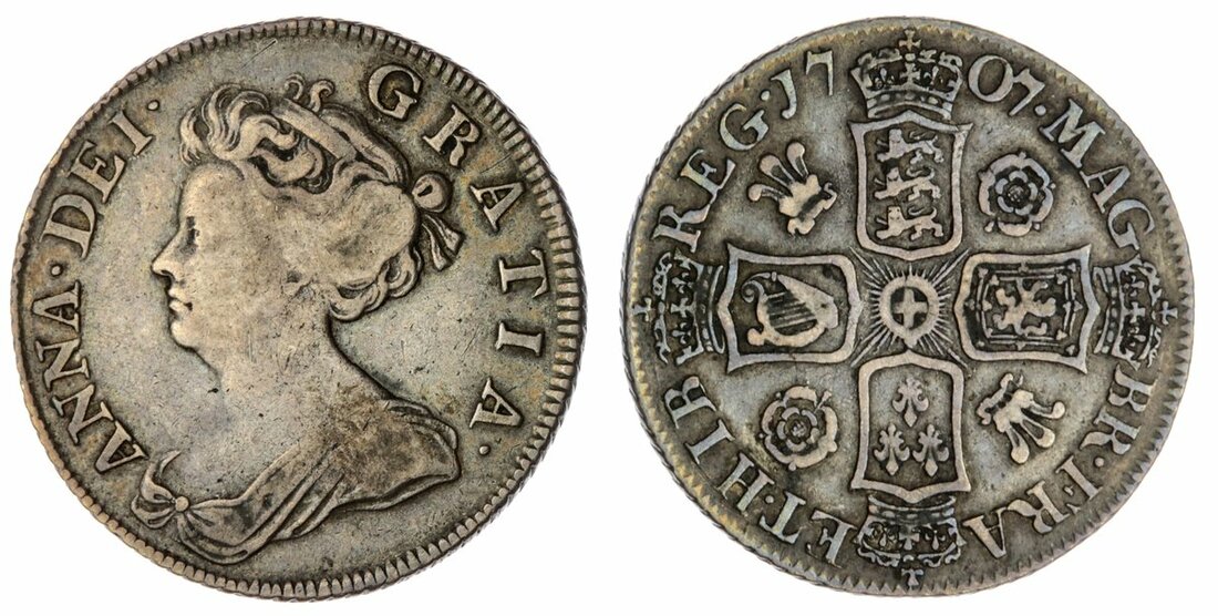 The L'Abbaye Collection | Anne (1702-1714), Pre-Union, 'Roses and Plumes' Shilling, 1707, second bust, rev. six strings to harp, angles plain, edge obliquely milled, 5.89g, 7h (Bull 1394; ESC 1137; Pywell-Phillips -; Spink 3589), rubbed and toned, fine / good fine