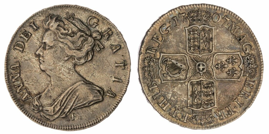 Anne (1702-1714), Post-Union, Edinburgh, Halfcrown, 1707 E SEXTO, London dies, seven strings, edge lettered downwards, 29.79g, 6h (Bull 1379; ESC 575; Spink 3605), a pleasingly bold strike, good very fine