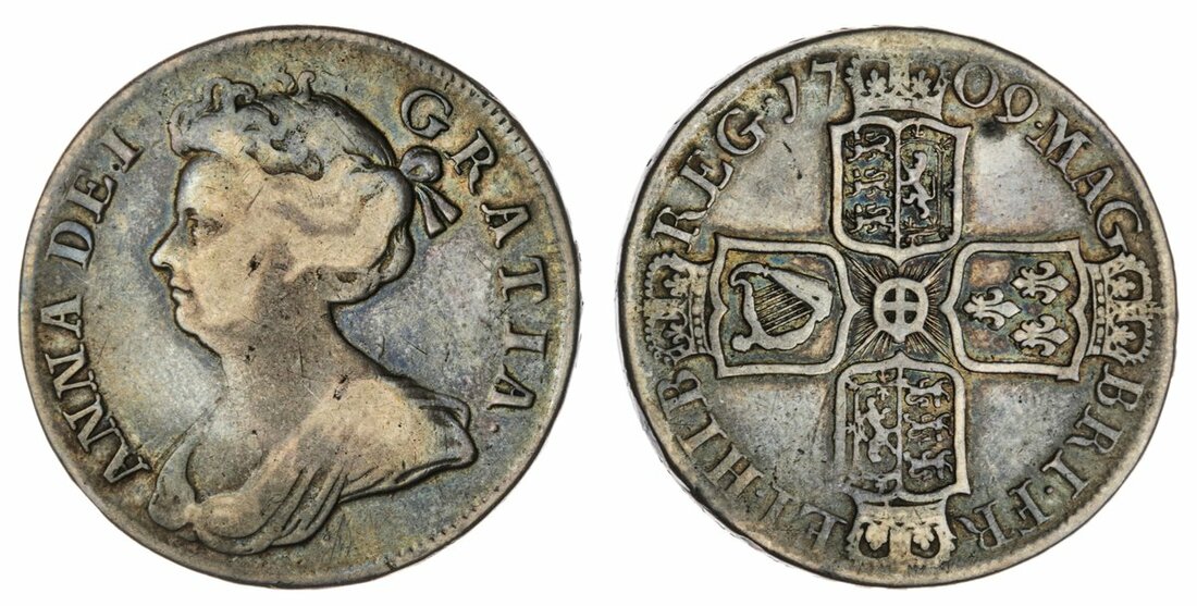 The Abramson Collection of English Coins | Anne (1702-1714), Post-Union, Halfcrown, 1709 OCTAVO, seven strings to harp, edge lettered upwards, 14.58g, 6h (Bull 1371; ESC 579; Spink 3604), rubbed, toned, fair / fine