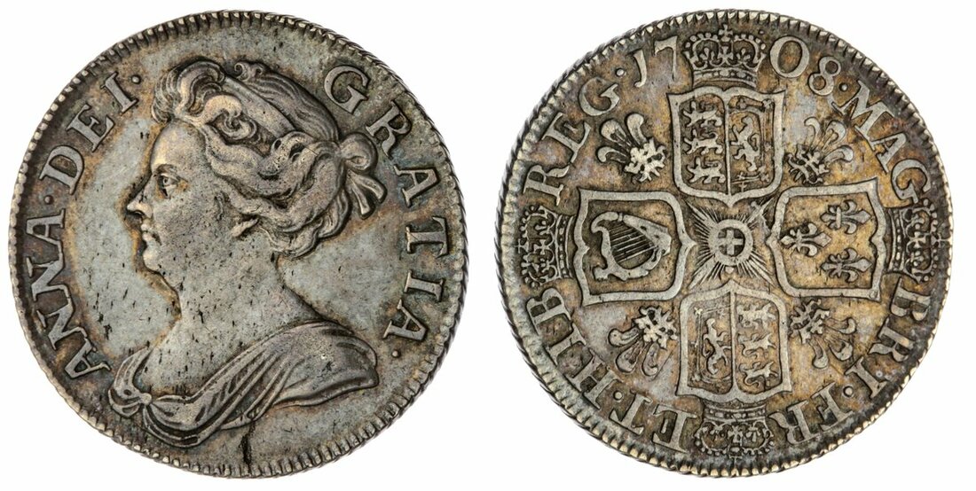The L'Abbaye Collection | Anne (1702-1714), Post-Union, 'Plumes' Shilling, 1708, third bust, rev. revised shields, seven strings to harp, plumes in angles, edge obliquely milled, 5.99g, 7h (Bull 1400; ESC 1148; Pywell-Phillips -; Spink 3611), flaw below bust, much residual lustre in recesses accentuated but flares of handsome toning, near very fine, the reverse better