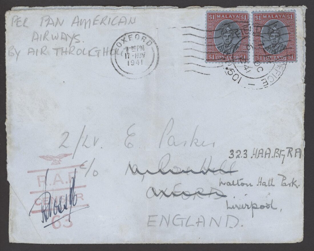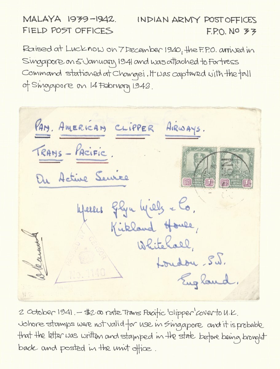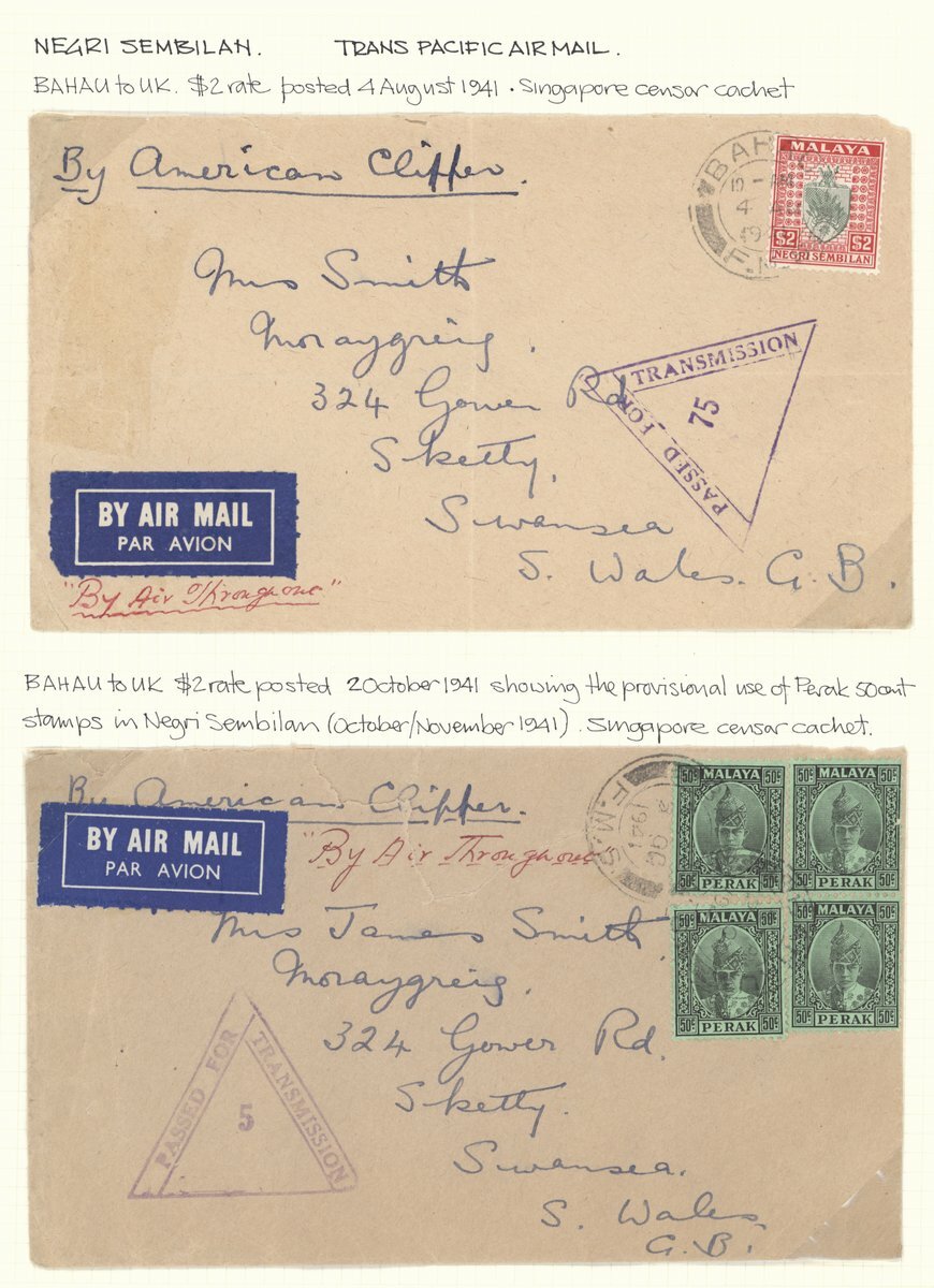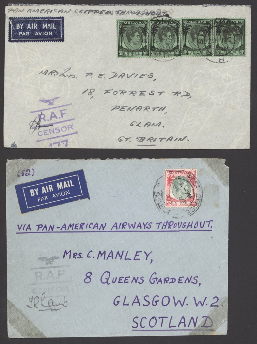 1941 (Aug.-Oct.) envelopes (5) flown by PAA Clipper Services from Singapore to San Francisco, then New York and onto UK, all by air, all franked at $2, from Singapore, F.P.O. S.P. 501 (2, one with Straits stamp and one with Pahang stamps), F.P.O. 33 (with Johore stamps) and Bahau (2, one with Negri Sembilan stamp, the other with Perak stamps).  A good group