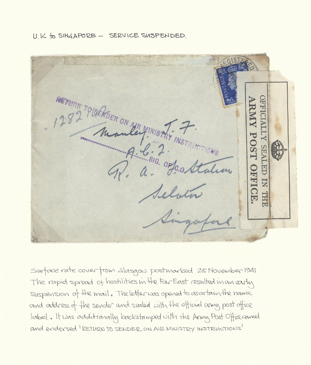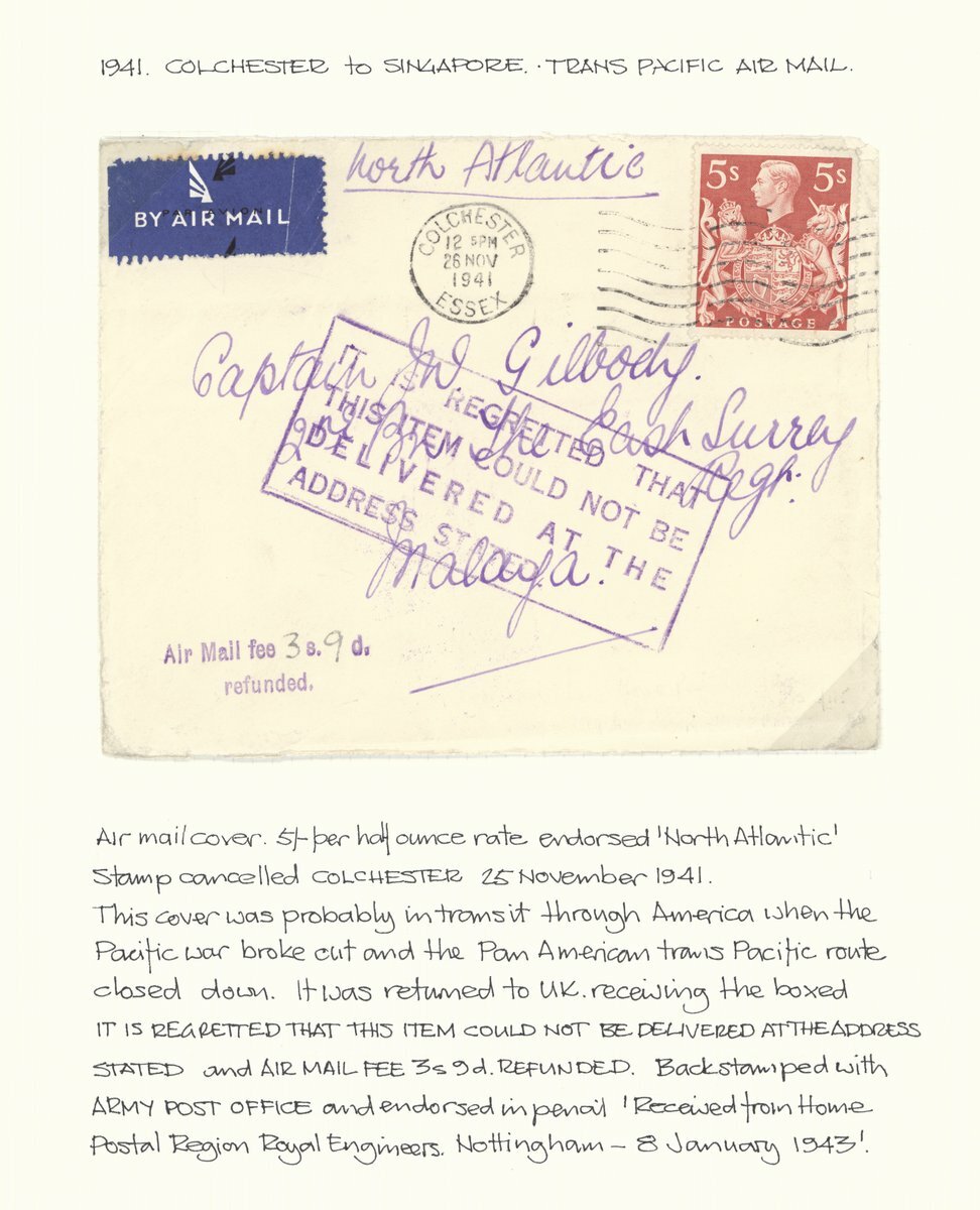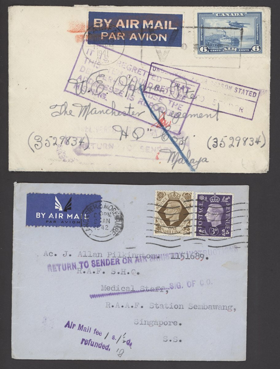 1941-42 envelopes from Canada (2 and GB (6) plus a label to Malaya showing a variety of markings including