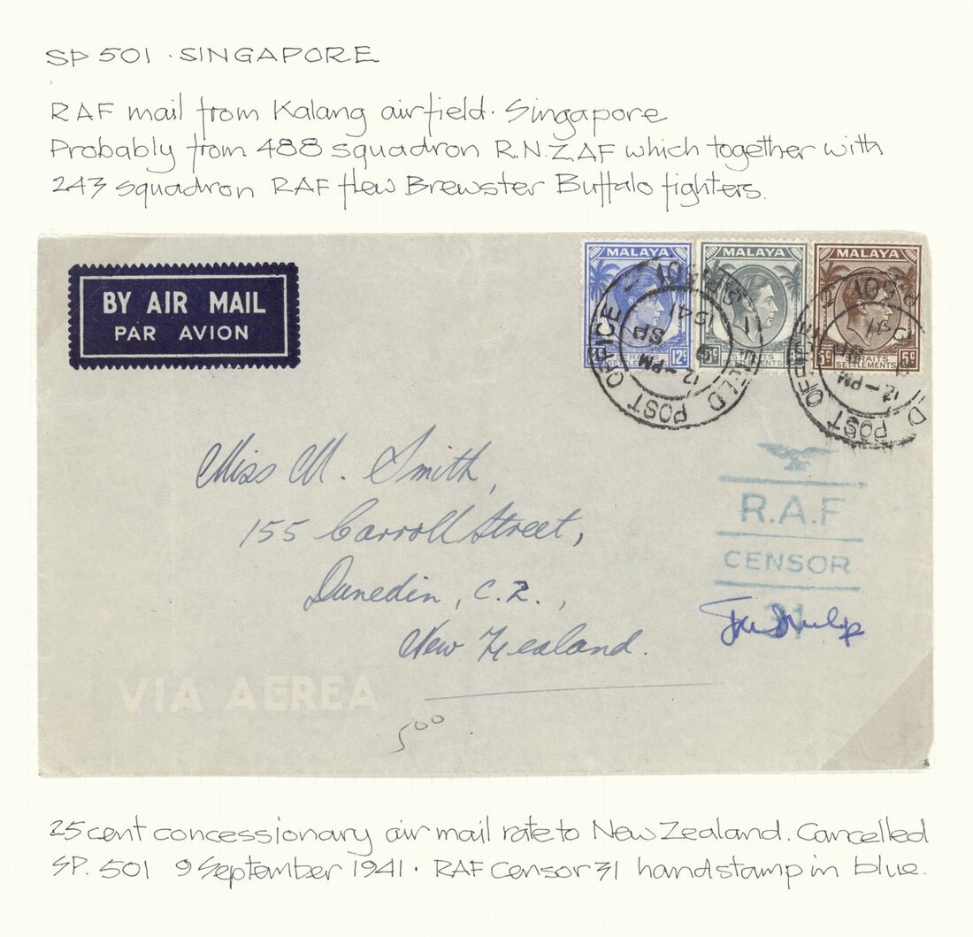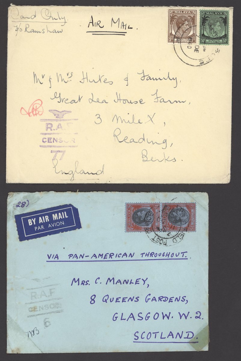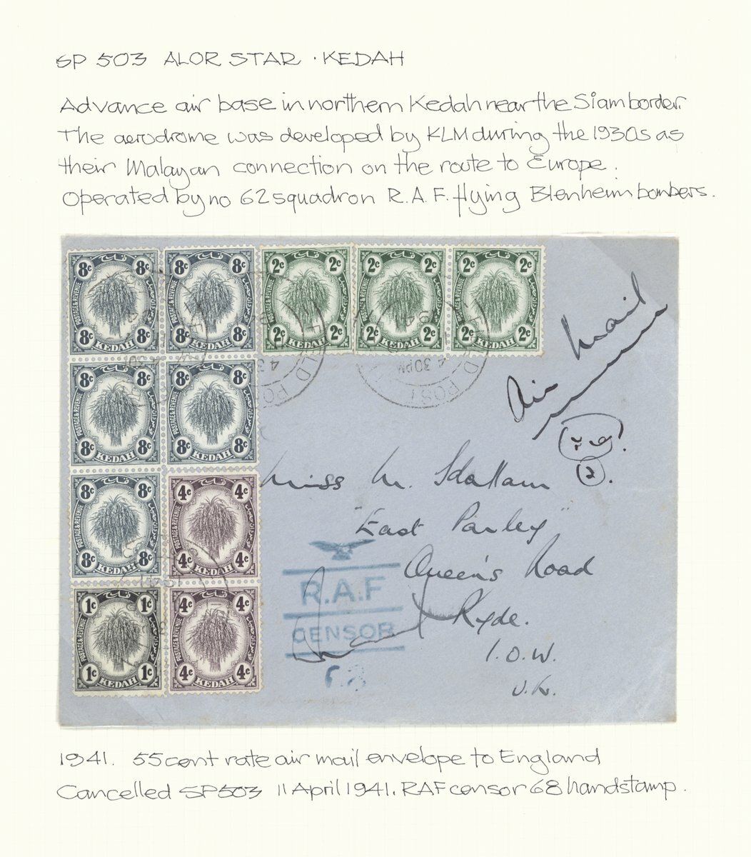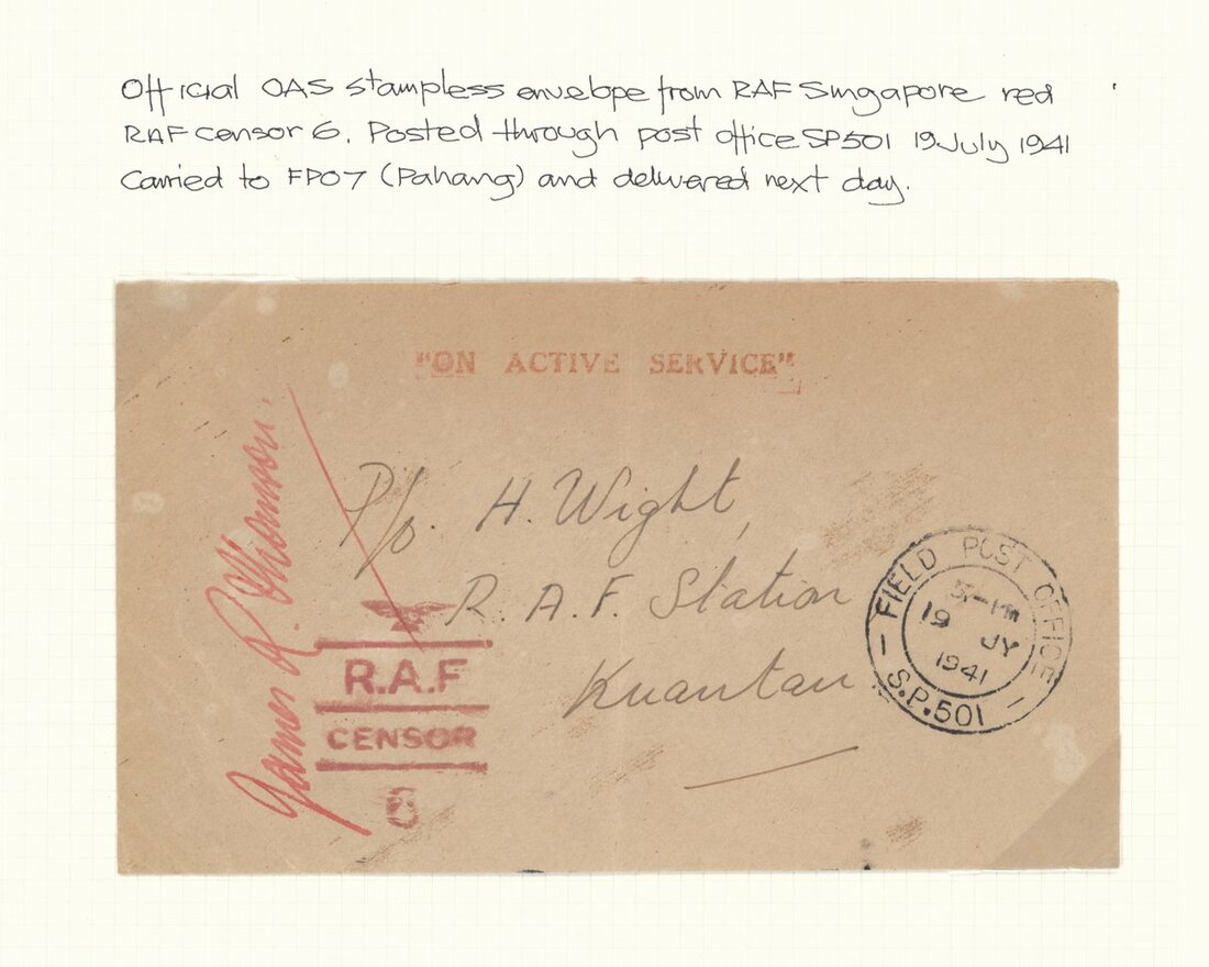 1941 envelopes (9) with four stampless and the others franked at 25c. (Straits stamps), 55c. (2, Kedah and Straits stamps) and $2 (2, Kedah and Straits stamps), datestamps include F.P.O. SP 501 (4) and 503 (3) and all show RAF Censor Nos. 6 (2), 17, 31, 68 (3), 74 and 77 in a range of colours; also 1946-67 stampless envelopes (2) showing