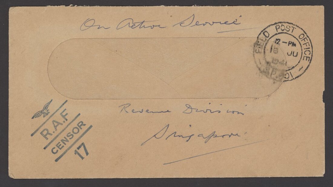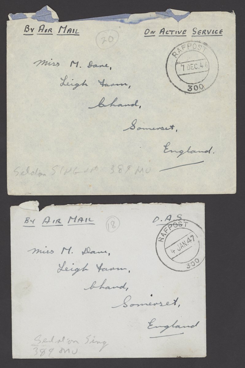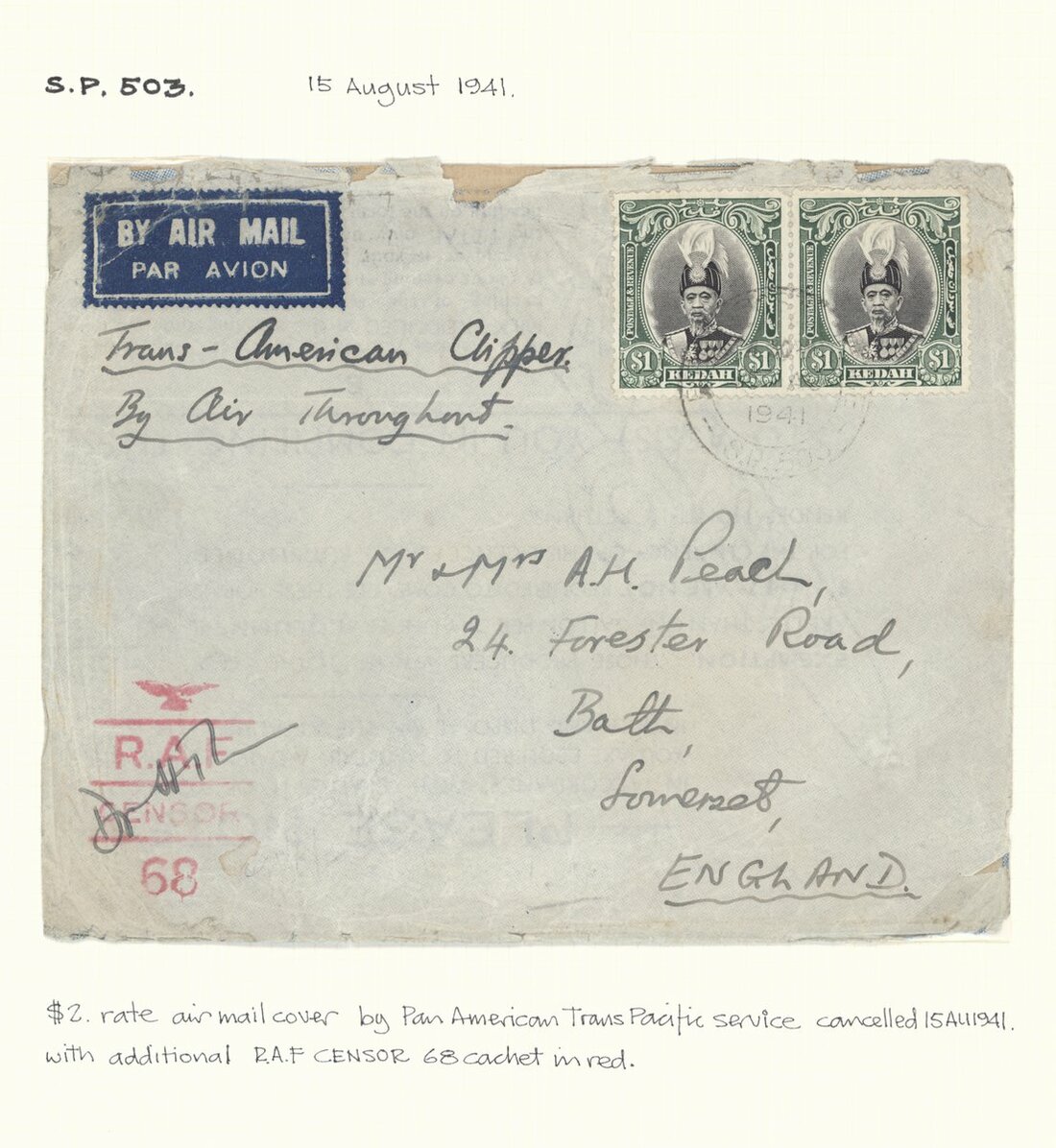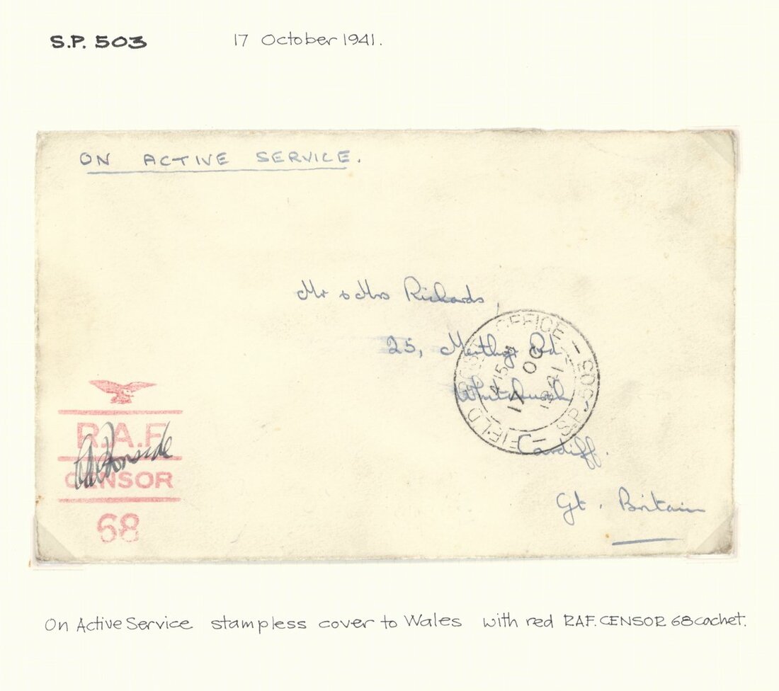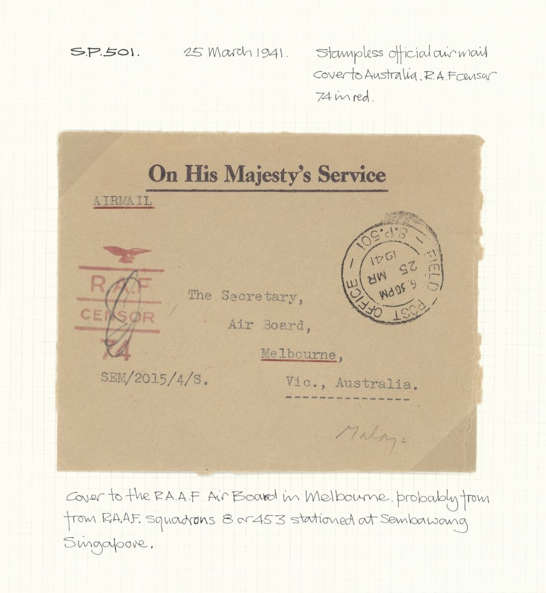 1941 envelopes (9) with four stampless and the others franked at 25c. (Straits stamps), 55c. (2, Kedah and Straits stamps) and $2 (2, Kedah and Straits stamps), datestamps include F.P.O. SP 501 (4) and 503 (3) and all show RAF Censor Nos. 6 (2), 17, 31, 68 (3), 74 and 77 in a range of colours; also 1946-67 stampless envelopes (2) showing