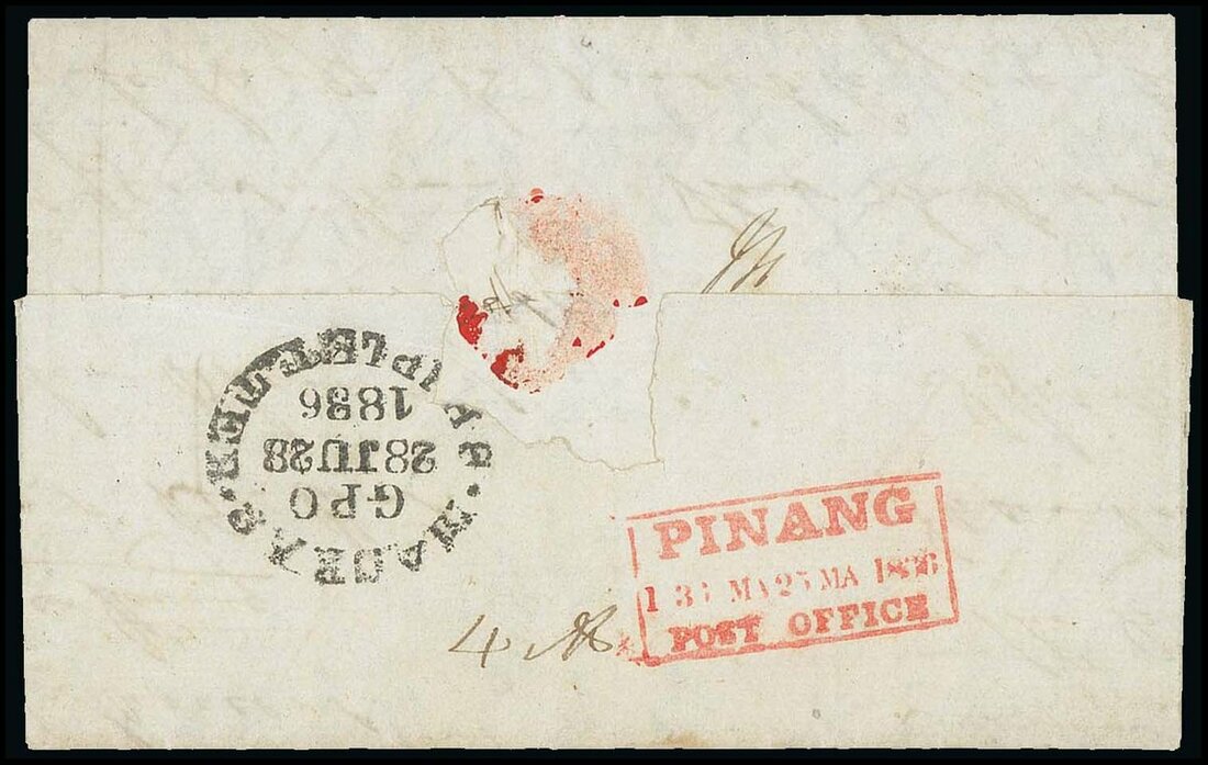 1835 (25 May) entire letter to Madras showing, on reverse, superb strike of framed