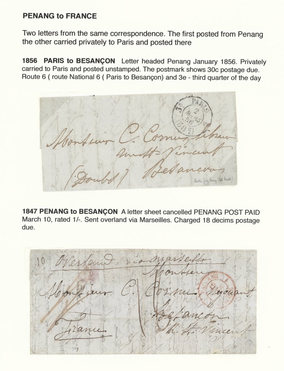 1847 and 1856 entire letters ex the same correspondence to Besancon, France, the first marked "Overland via Marseilles", rated "1/-" and showing light but legible "