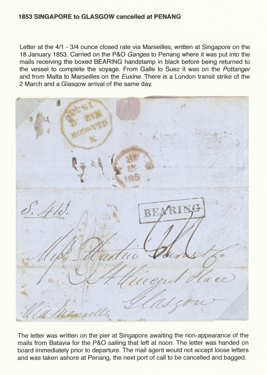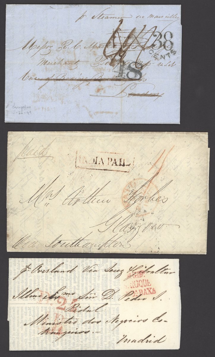 1850 printed "Supplement to the Overland Singapore Free Press" "per Overland Via Suez & Gibraltar" to Madrid announcing the death of late Sir Joze D'Almeida and with Alexandria and Madrid handstamps and rate marks; 1849 entire letter "per Steamer via Marseilles"