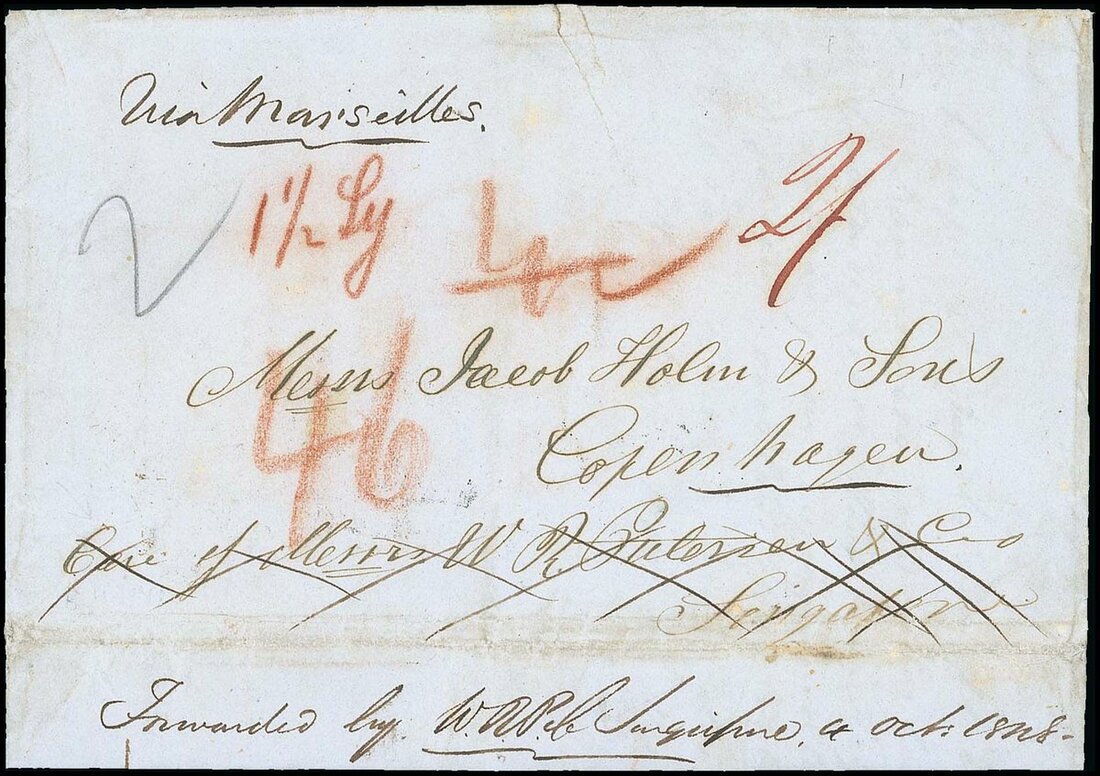 1848 entire letter from a Danish trader J.M. Lang at Bally Badong "Care of Messers. J.R. Paterson & Co. Singapore" and "via Marseilles" to Copenhagen, carried privately to Singapore, variously rated and showing, on reverse "Forwarded by W.R.P. & Co. Singapore", Alexandria British P.O. datestamp, Malta disinfected handstamp and Hamburg datestamp (20.11), contents include "Trade here in the Indies is going very badly. For the moment things are peaceful here but the coast except for Badong is blockaded everywhere. Recently here the Dutch were driven on board their ships by the people of Bally"; highly unusual. Photo