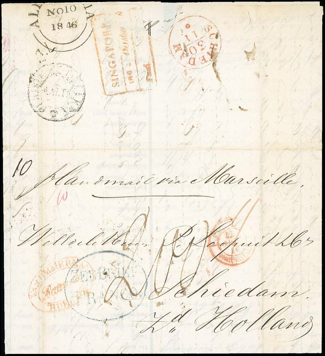 1846 (Sept.) entire letter via Singapore, Alexandria, Malta and France to Schiedam, Holland showing oval-framed "