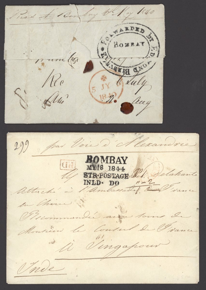 1826 entire letter from Calcutta marked "HCCS Juba", no postal markings, 1840 entire letter from Manila "p Str Berenice to Suez" and "Overland via Marseilles" to London, rated "3/6" with oval-framed "