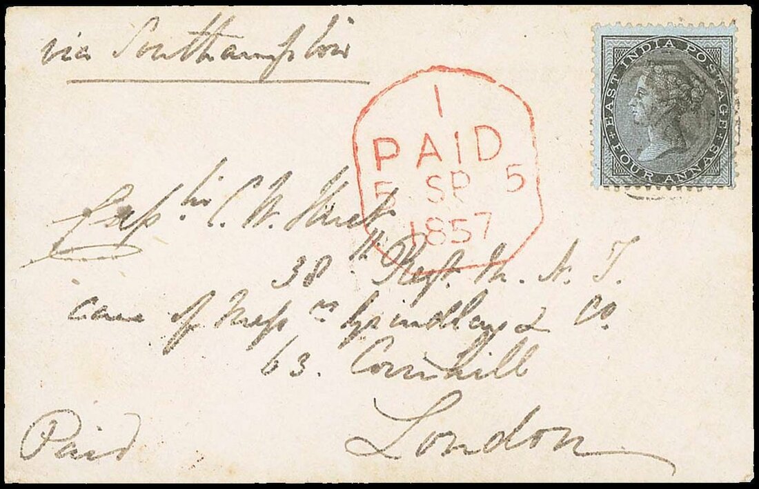 1857 (18 July) envelope from Singapore to London, marked "via Southampton", bearing 1855-65 4a. black on blued paper tied by "B/172" obliterator, showing red Paid arrival d.s. (5.9) alongside and, on reverse,