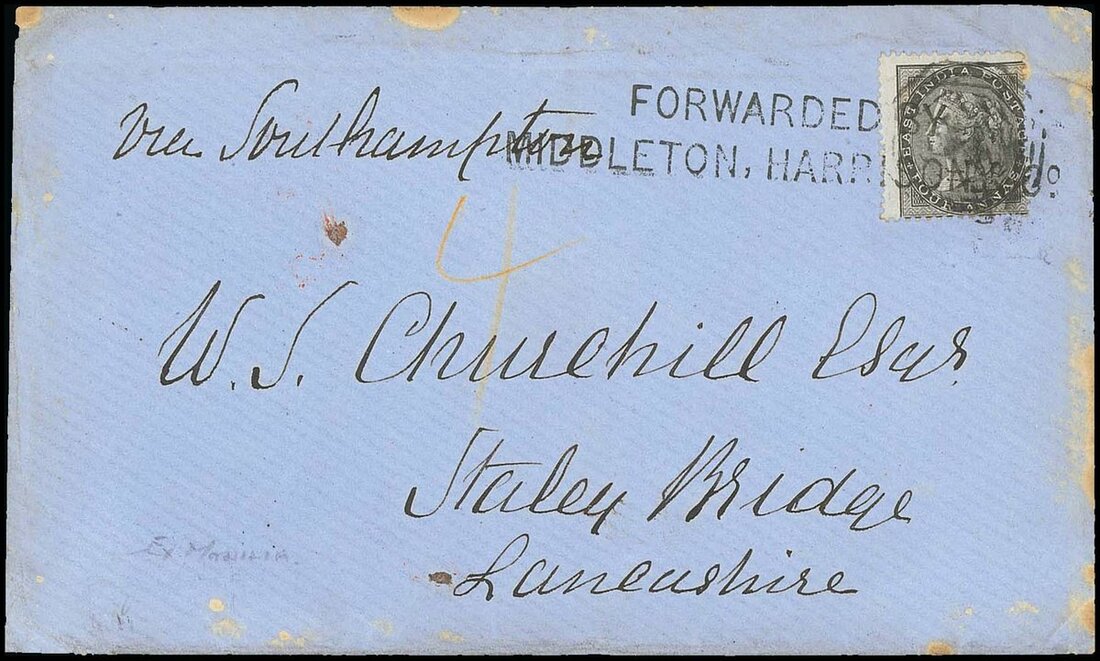 1861 blue envelope from Manila? to England, marked "Via Southampton", bearing India 1855 4a. black cancelled "B/172", tied by large