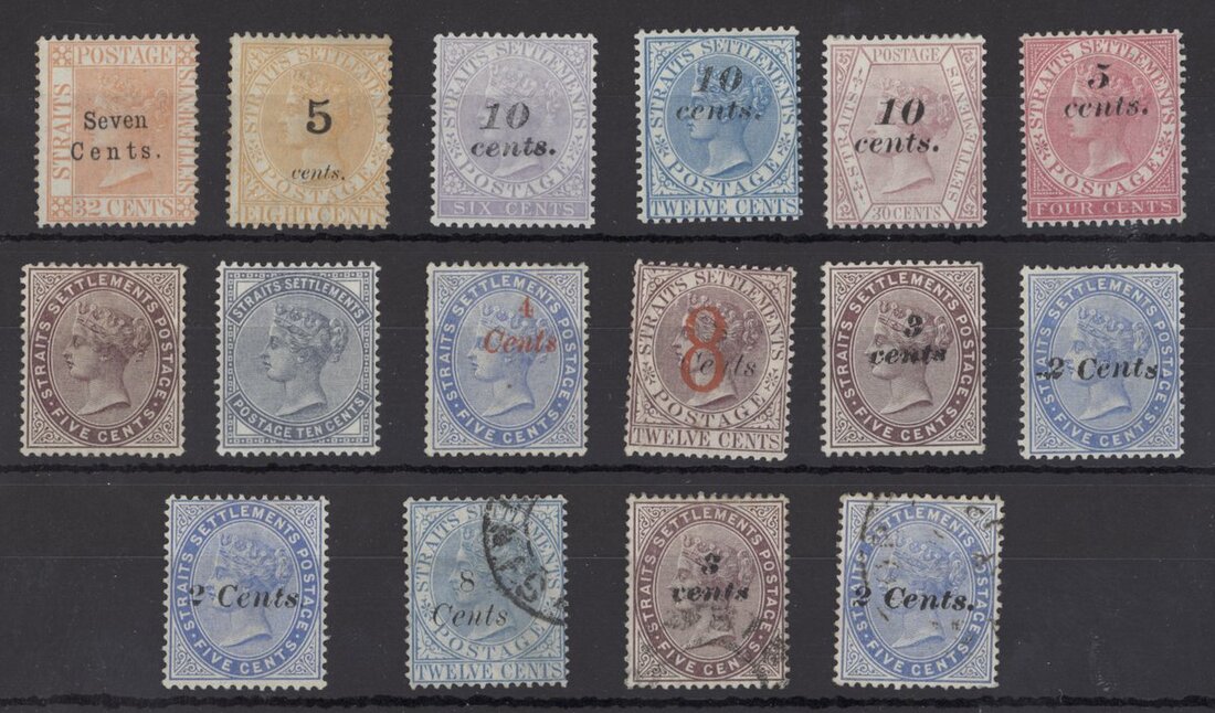 1879 7c. on 32c., 1880 (Aug.) 5c. Type 13 on 8c., 1880-81 10c. on 6c., 10c. on 12c. and 10c. on 30c., 1882 (Jan.) 5c. on 4c., 1882 (Jan.) CC 5c. and 10c., 1884 4c. in red on 5c., 1884 (Sept.) "8" on 8c. on 12c., 1886 (Apr.) 3c. on 5c. and 1887 (July) 2c. on 5c. (2), unused or with part original gum; 1884 (Feb.) 8c. on 12c., 1886 (Apr.) 3c. on 5c. and 1887 (July) 2c. on 5c. used; the "8" on 8c. on 12c. with a vertical crease though generally of good to fine appearance. Cat. £3,900
