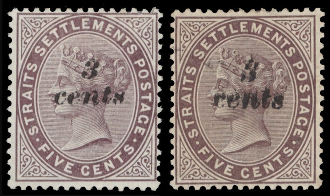 1886 (Apr.) 3c. on 5c. purple-brown (2), one with "second", jarred, impression of the surcharge, part original gum with the variety a little toned. A scarce pair. B.P.A. Certificate (2009) for the second impression. S.G. 84, 84 var., £650+