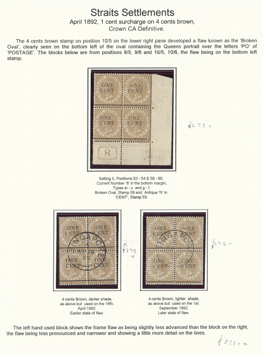 1c. on 4c. brown lower right corner unmounted mint block of four with current number "8" and two used blocks of four with central April and September 1892 datestamps, all [53-60] with [59] in each showing broken oval flaw, the used blocks showing early and later states of the flaw. A fine trio. S.G. 89b, £725+