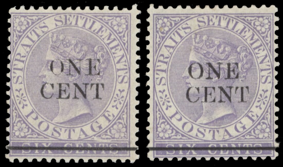 1c. on 6c. lilac, variety watermark inverted, two examples in slightly different shades, good to fine mint. S.G. 90w, £650