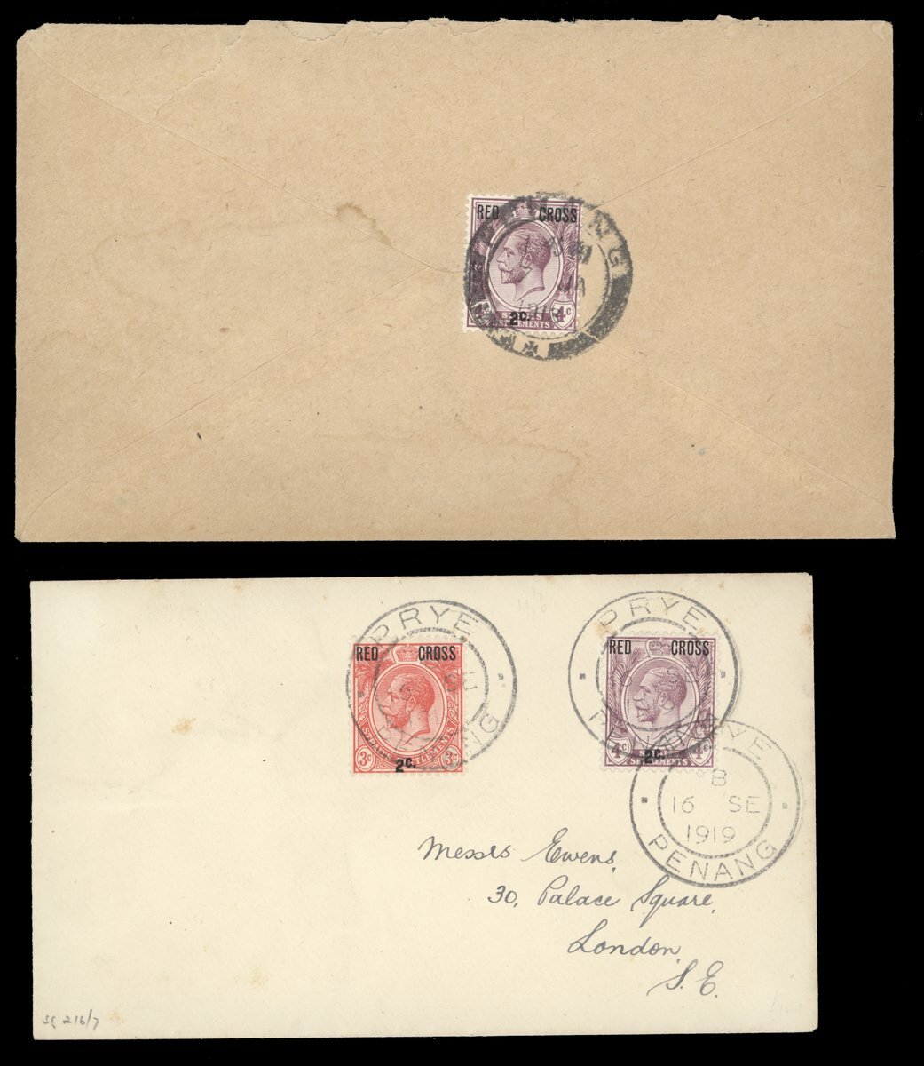 1917 (Mar.) Red Cross 4c.+2c. tied by Penang double-ring d.s. on reverse of locally addressed 1918 (7 Jan.) envelope; also 3c.+2c. and 4c.+2c. tied by