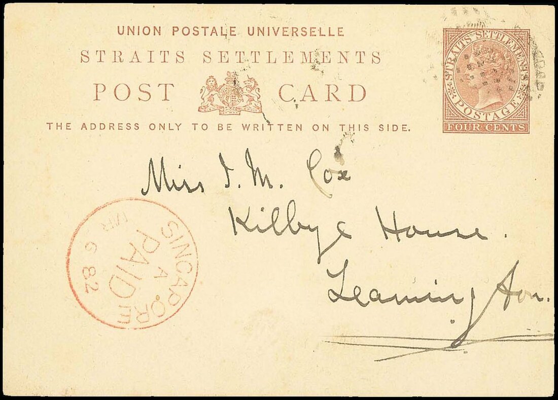 1880 4c. brown from Singapore to Leamington, cancelled with obliterator and showing fine "