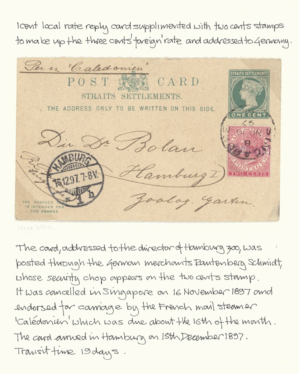 1884 1c. green reply card uprated with 2c. carmine, 1897 "Per ss Caledonien" to the director of the Hamburg Zoo, the 2c. with pre-cancelled sender's handstamp of Rautenberg Schmidt and sharing Singapore datestamp, arrival datestamp at foot