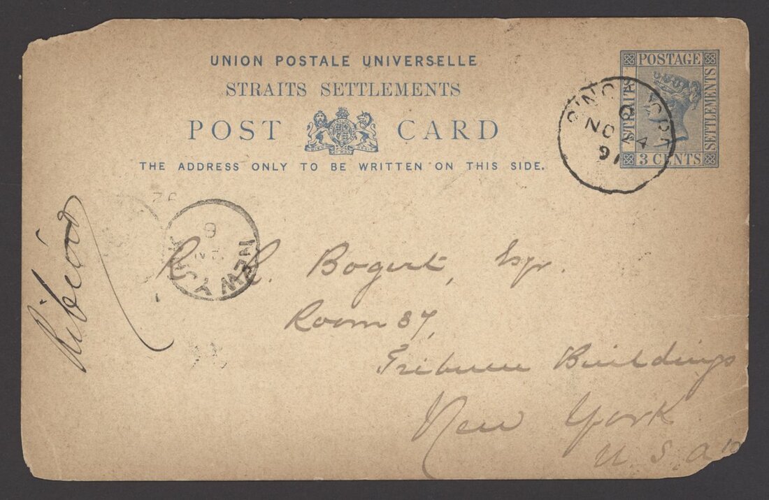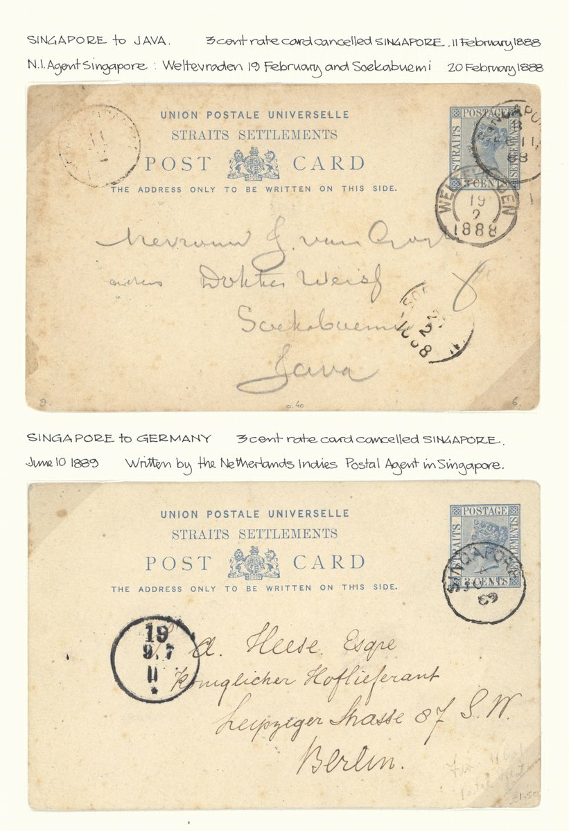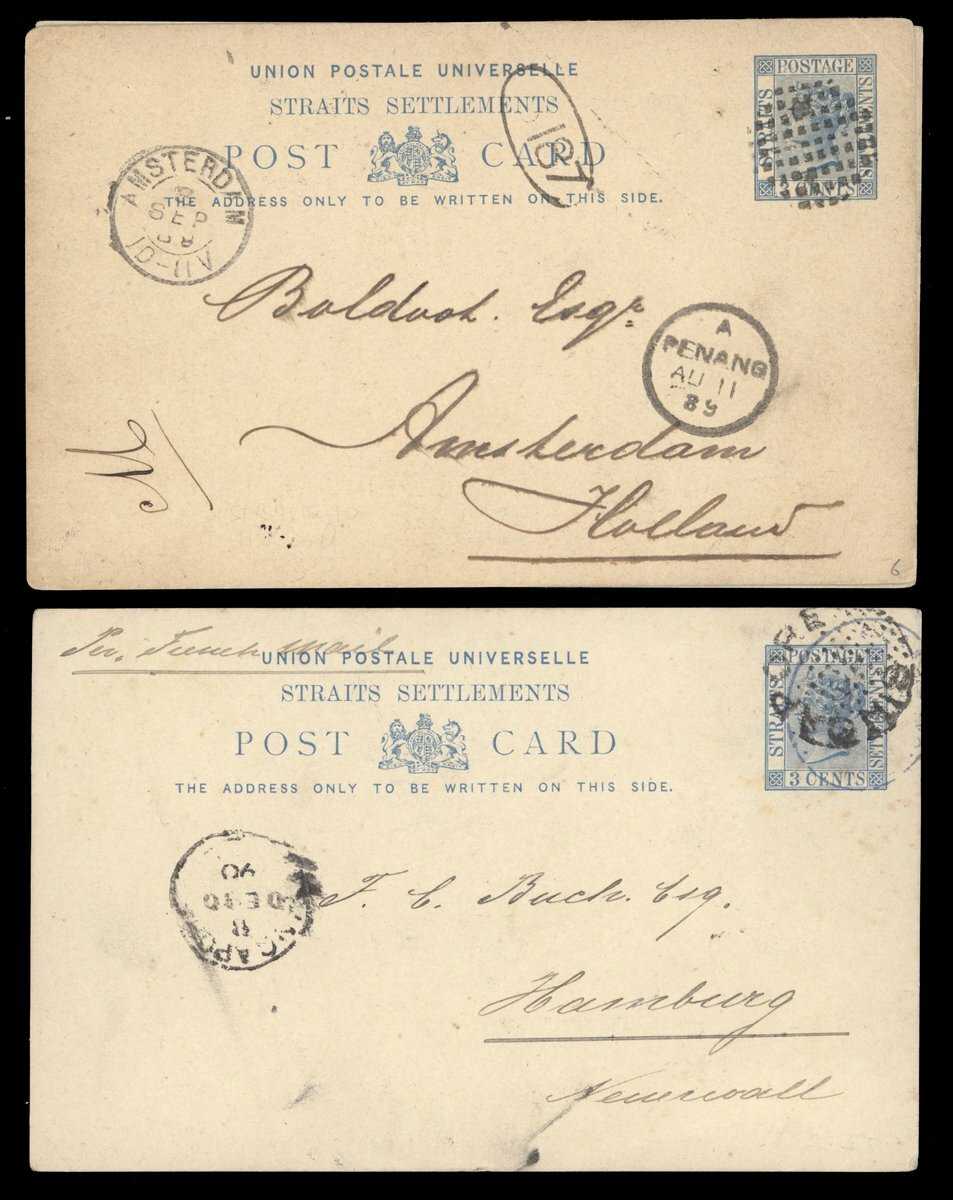 1886 3c. blue (4) used in 1889-90 to Batavia, Germany (2) and Holland, one from Penang with circle of dots, one with Singapore dotted circle handstamp, one from Penang with oval of bars and one with Singapore datestamp, all fine; also another to Java in 1888 (additional stamp remove) and another (very poor) to U.S.A. in 1891. HG 6