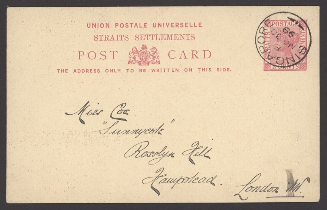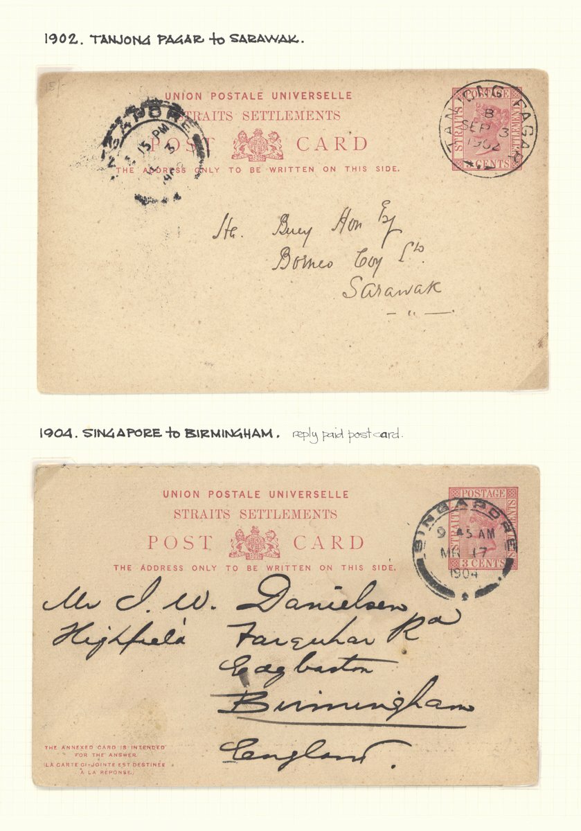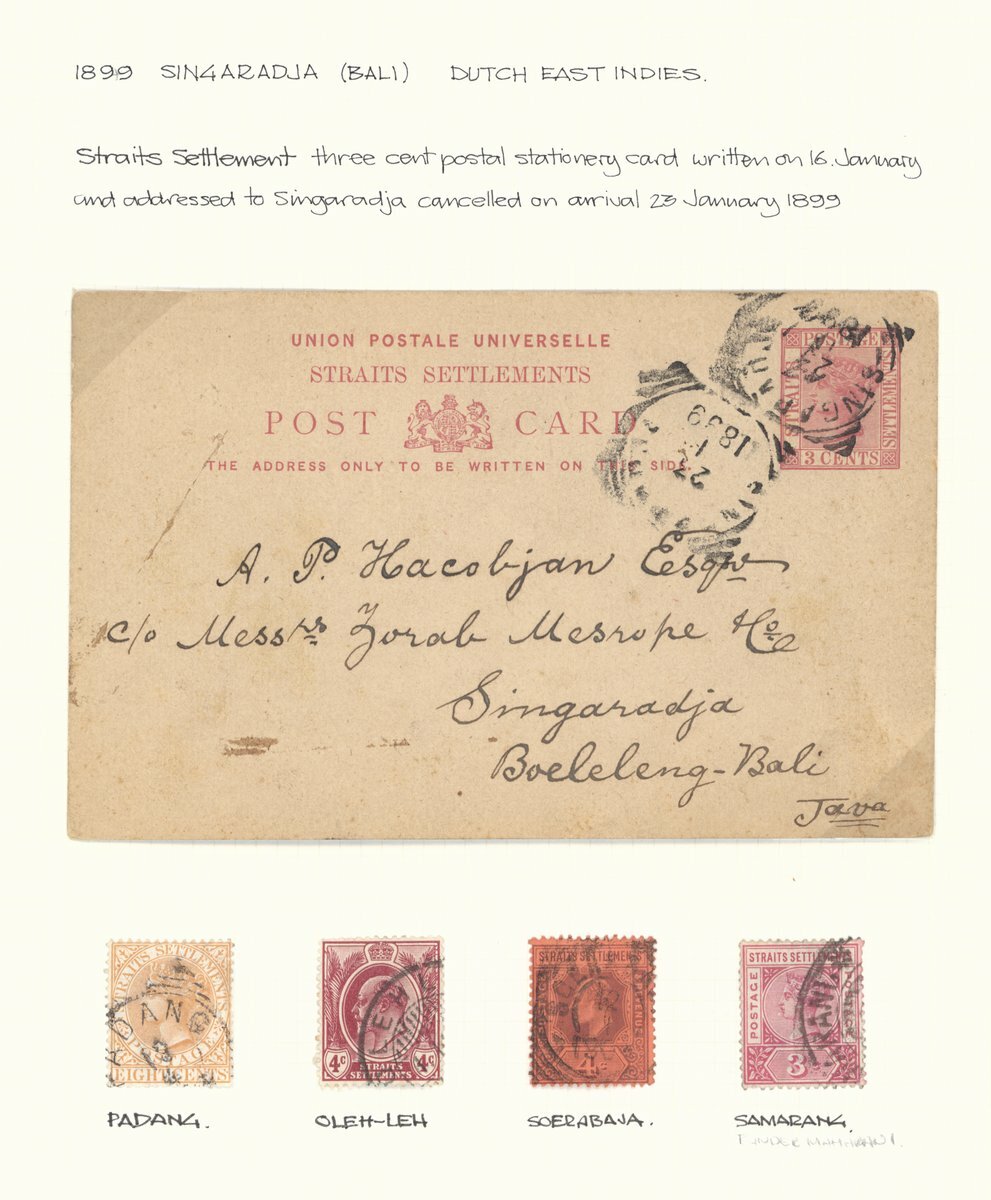 1893 3c. carmine (3), two used from Singapore to Java with squared-circle datestamp and to London with circular datestamp in 1899, the third used from Tanjong Pagar to Sarawak in 1902 with Singapore transit datestamp, and a reply card from Singapore to England in 1904 cancelled with double-ring datestamp; also four loose adhesives with cancellation of Dutch East Indies post offices. HG 13