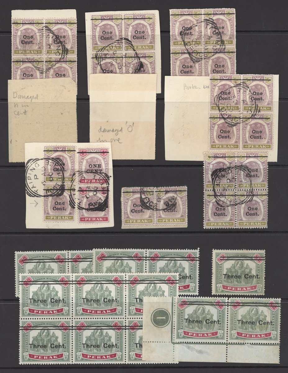 1886 2c. Type 16 used, 1895-99 1c., 2c. (3) and 4c. mint, 1c. (9), 2c. (7), 3c. (11) and 8c. used, 1900 1c. on 5c. (32 comprising seven blocks of four and two pairs, between them including antique "e" on "One" (2), antique "e" in "Cent", two with damaged letters and one with broken bar, all used and on pieces), 3c. on 50c. used and 3c. on $2 (13 with three pairs and a blocks of six, all unused without gum), generally good to fine. Cat. c. £2,300