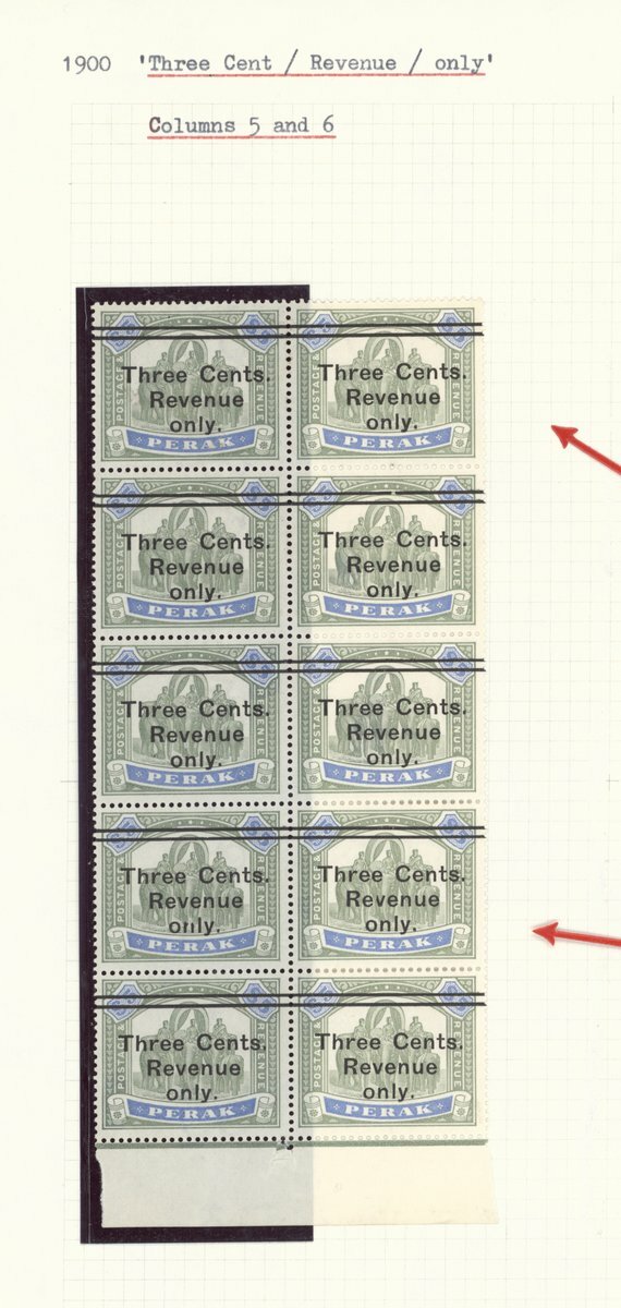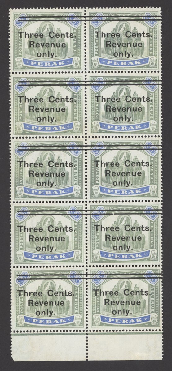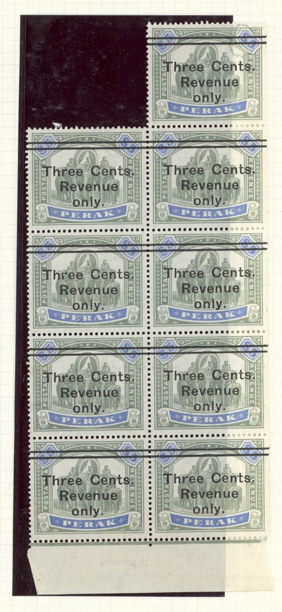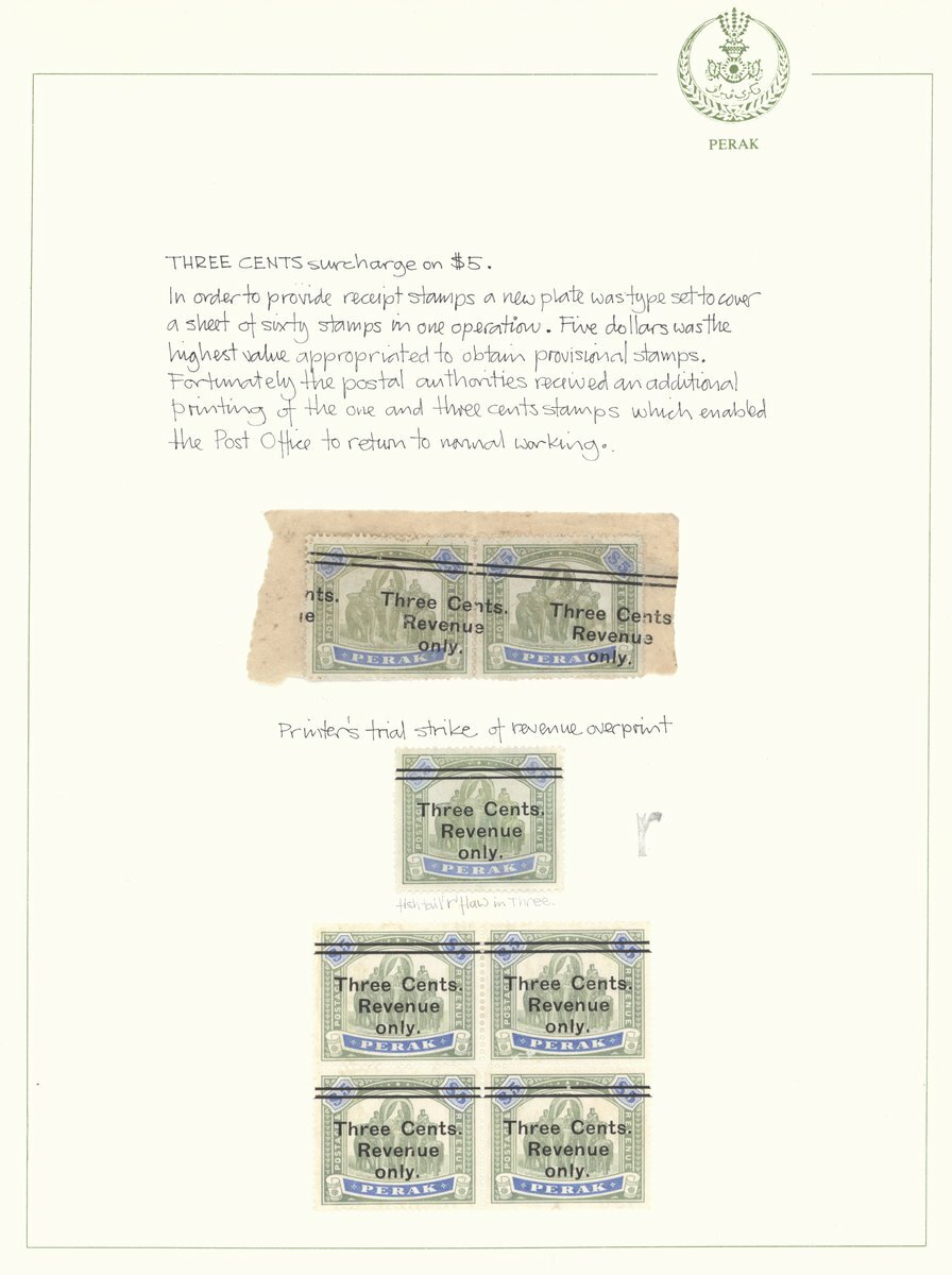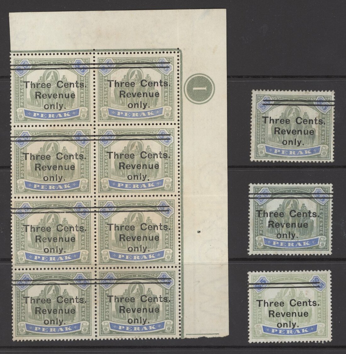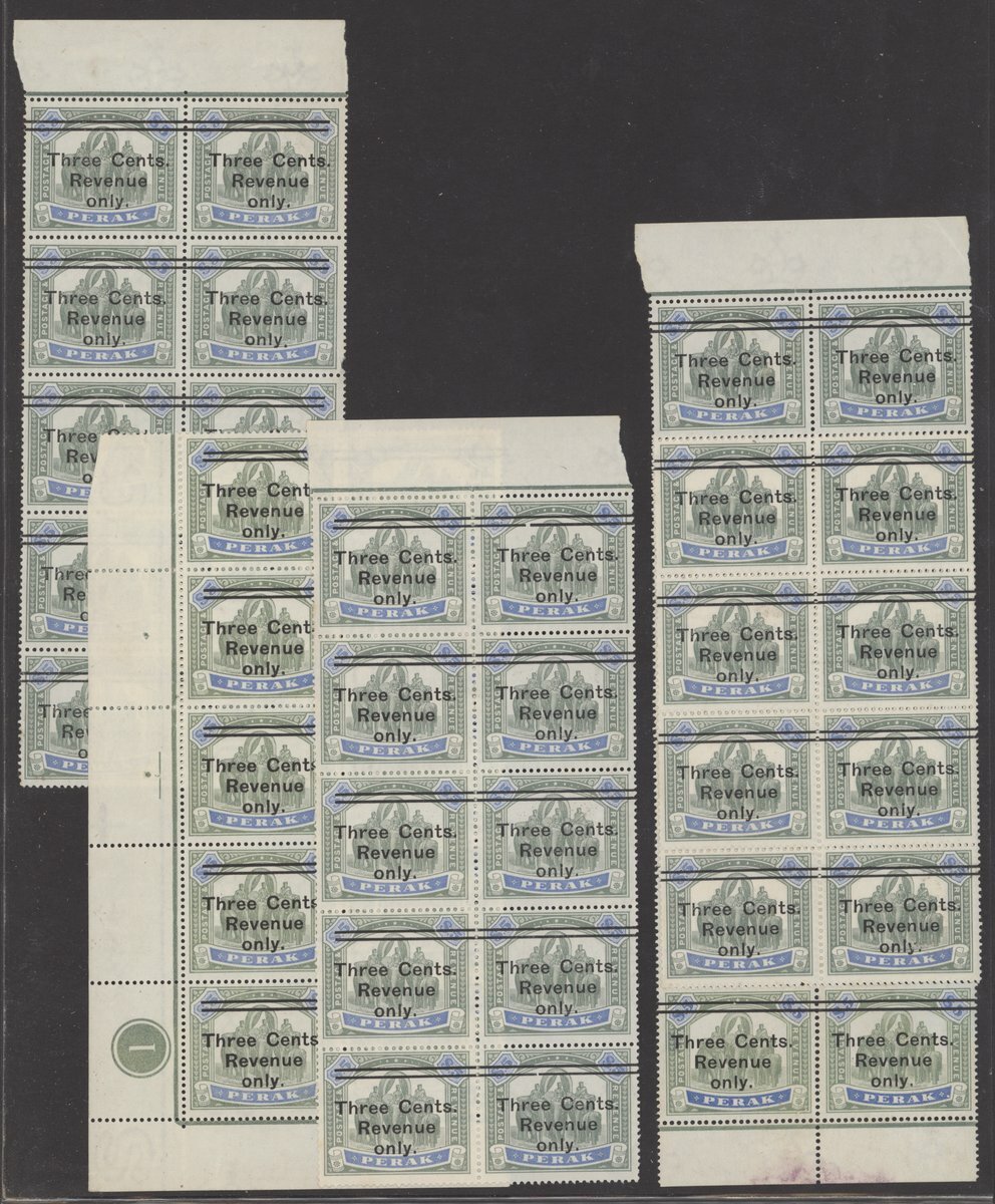 3c. on $5 green and ultramarine range comprising unused blocks of twelve, ten (5), nine, eight and four a pair on piece showing misplaced surcharge (printer's trial?) plus singles (8, four used); condition generally fine for these