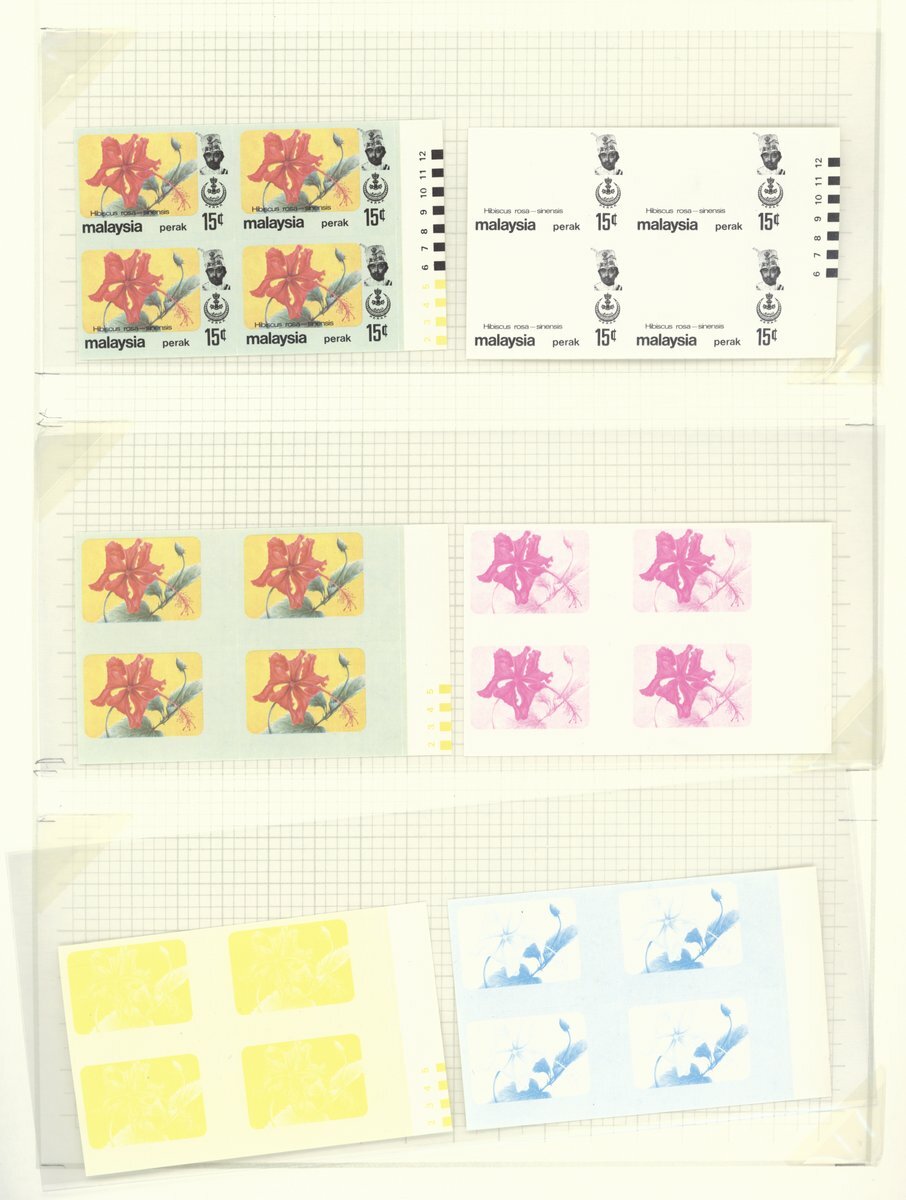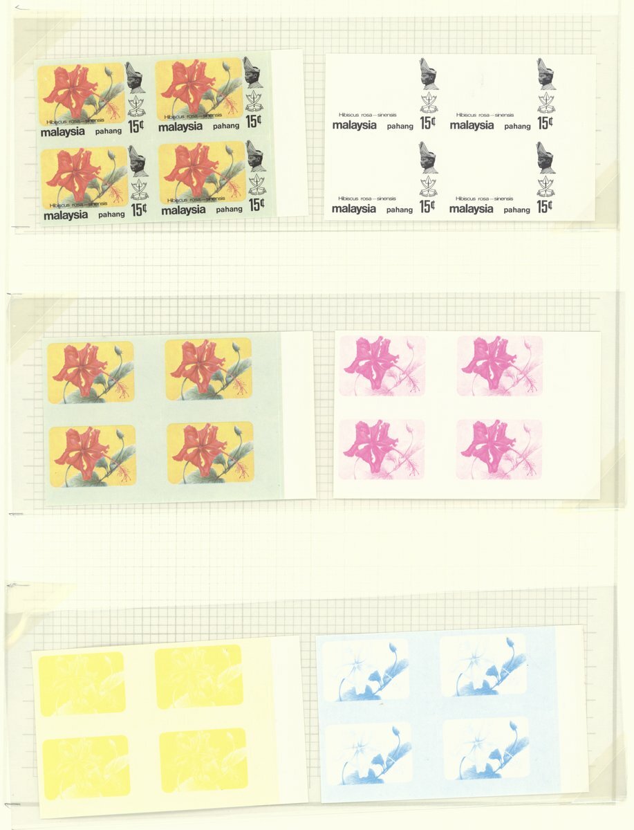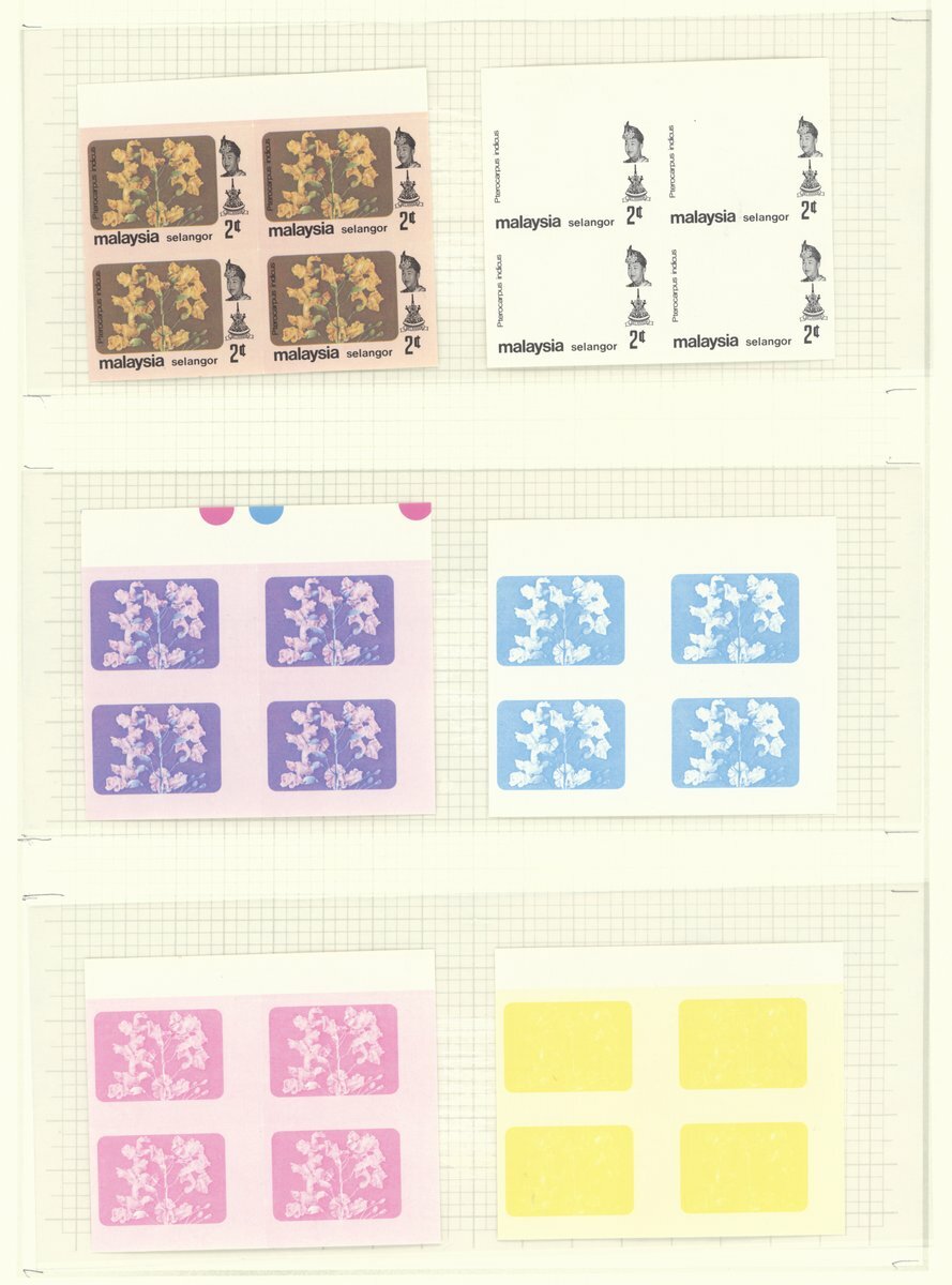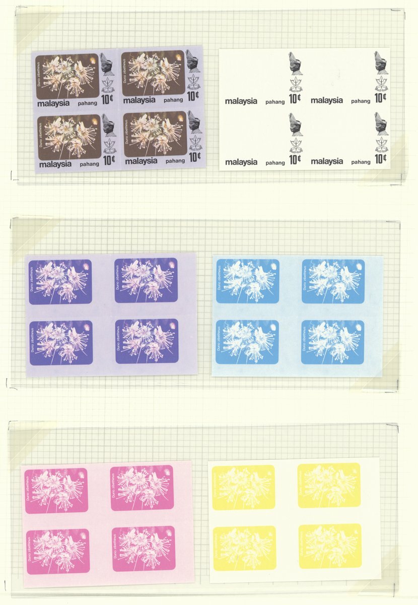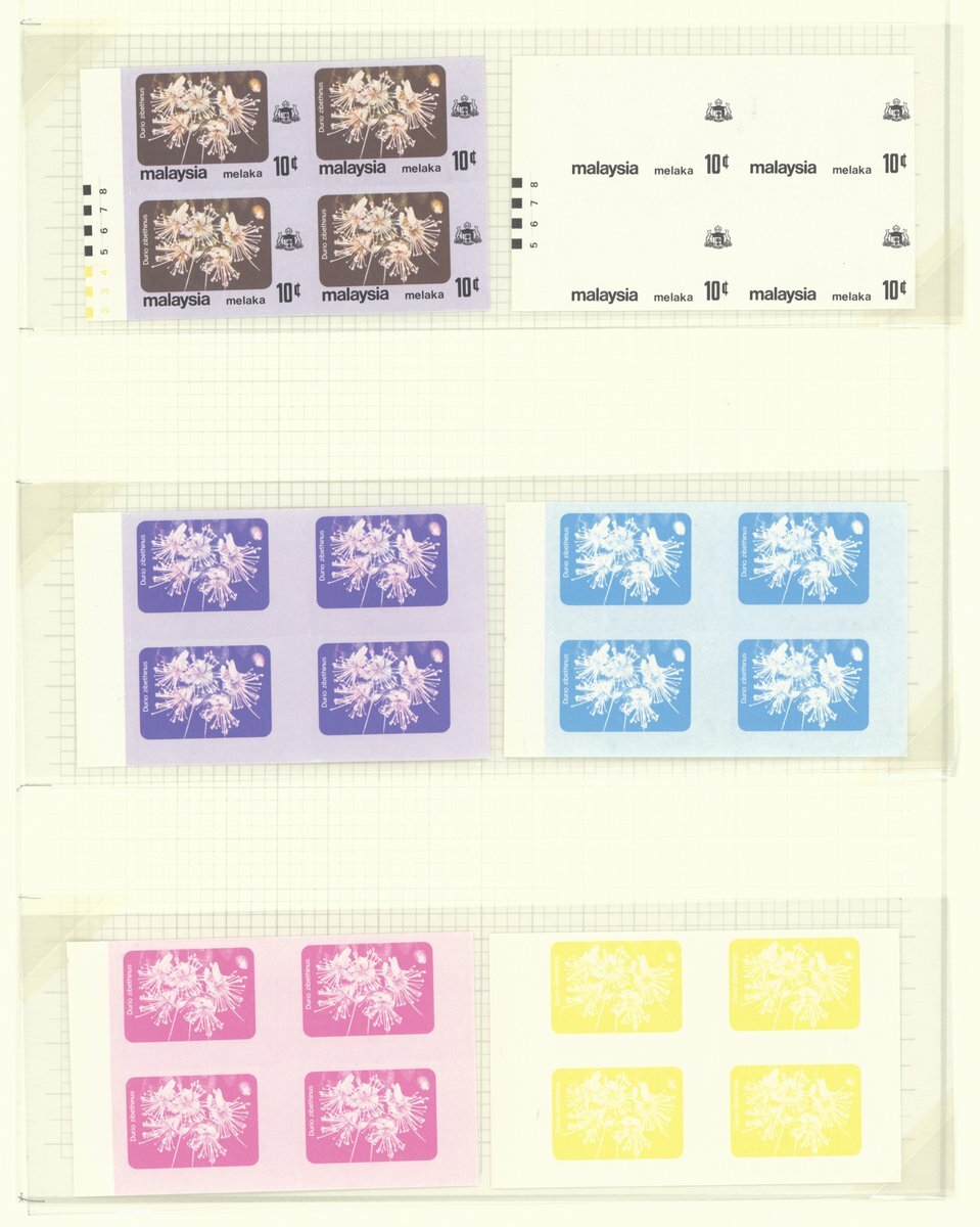 Johore 1c., 10c. and 15c., Kedah 1c., 2c. and 5c., Kelantan 20c., Malacca 10c. and 15c., Negri Sembilan 1c. and 5c., Pahang 2c., 10c. and 15c., Penang 20c., Perak 2c., 10c. and 15c., Perlis 1c., 5c., 20c. and 25c., Sabah 2c. and 5c., Sarawak 2c. and 10c., Selangor 1c. and 2c., and Trengganu 1c., 5c. and 10c., imperforate colour separations of each comprising cyan, yellow, magenta and cyan + magenta (except 15c. which has cyan + blue + magenta), black and as issued, each in a block of four, fine. (186 blocks)