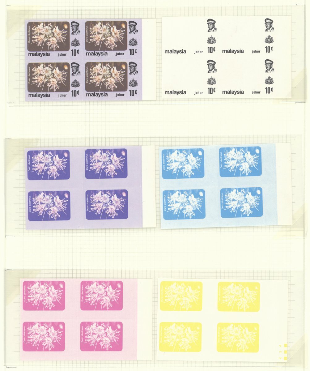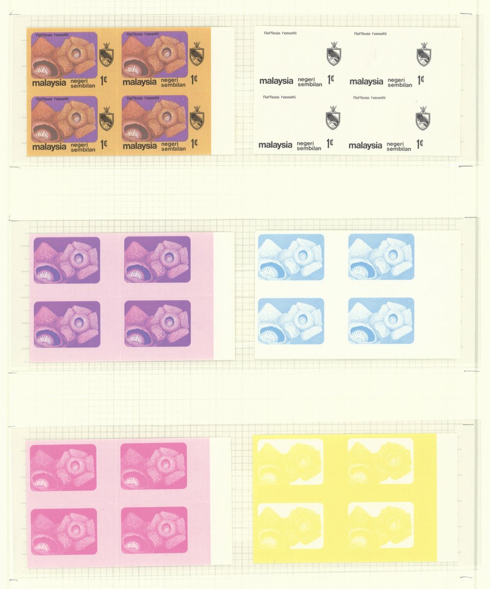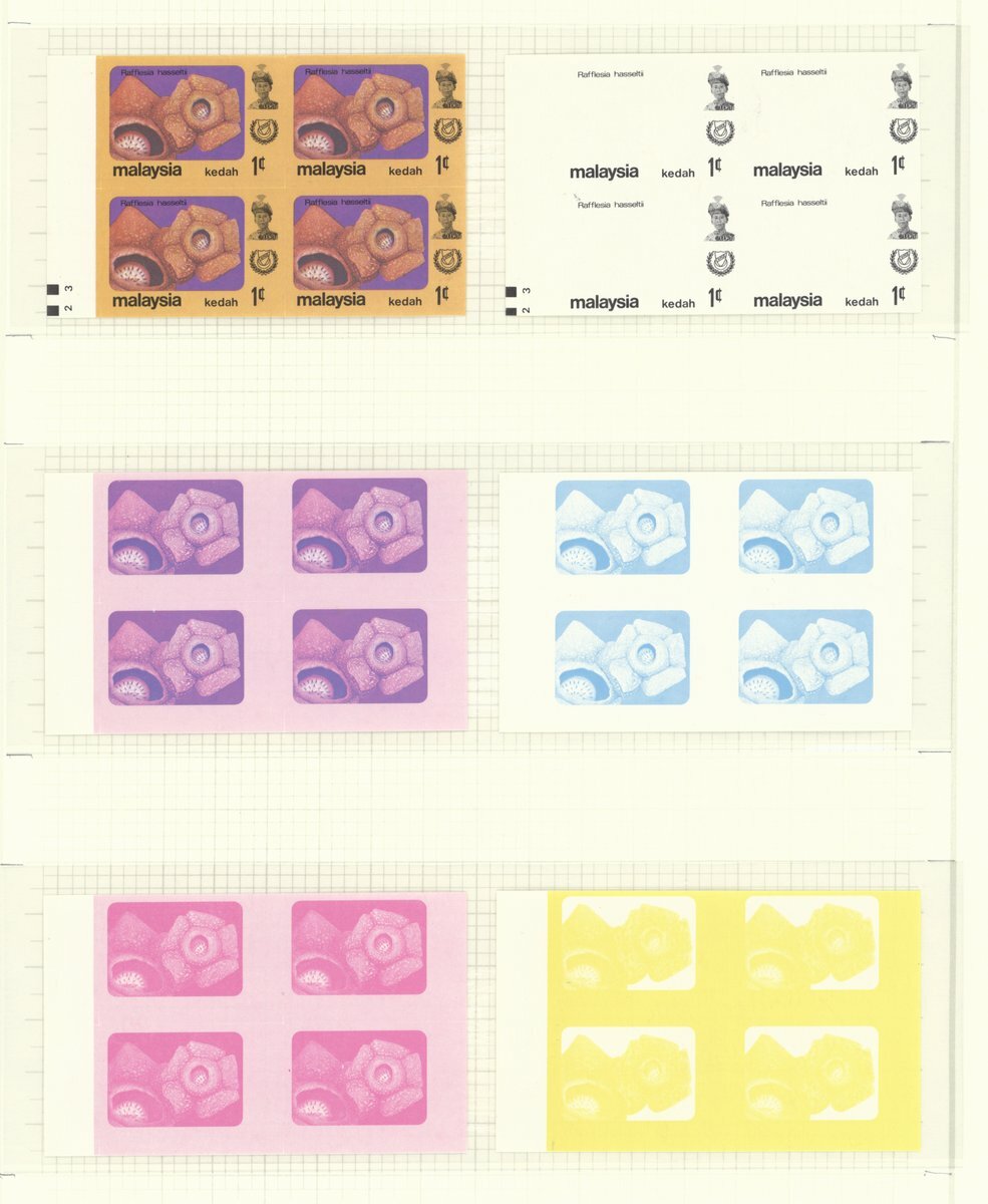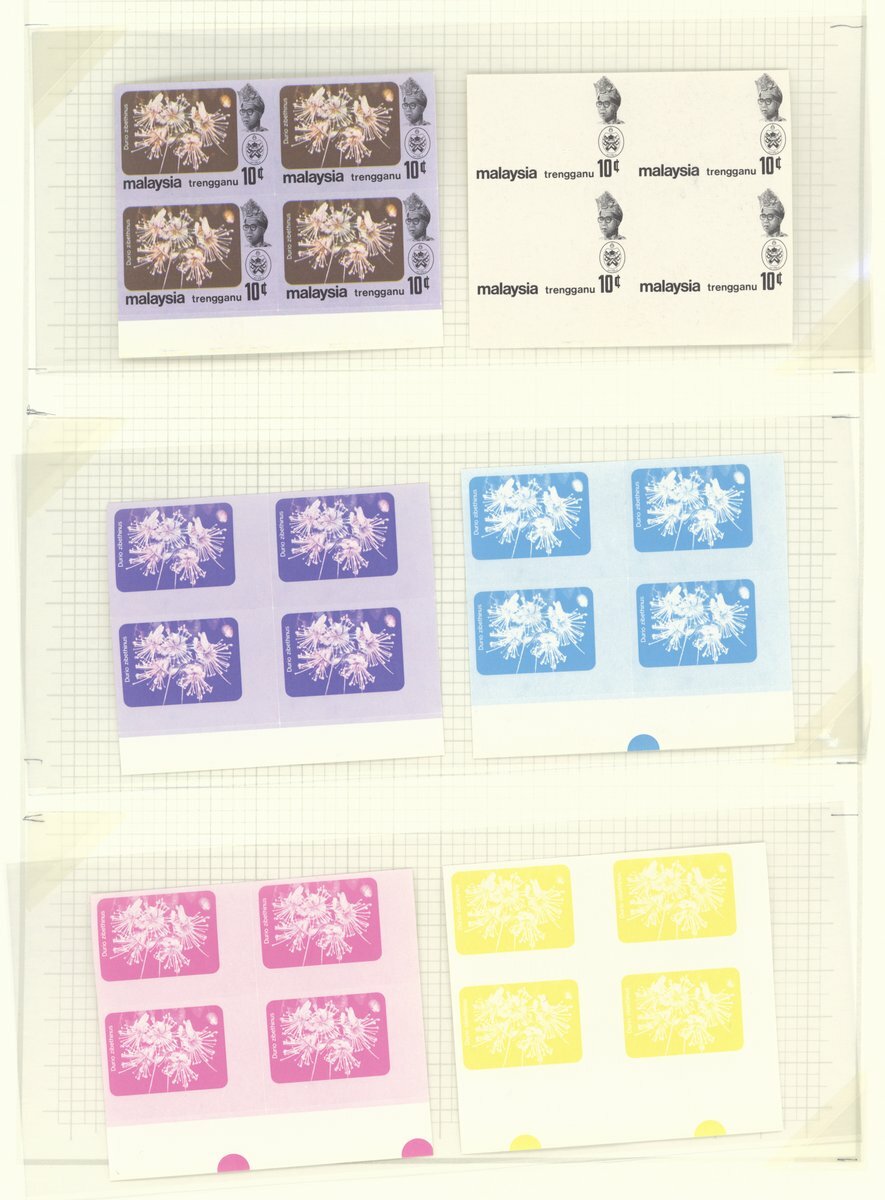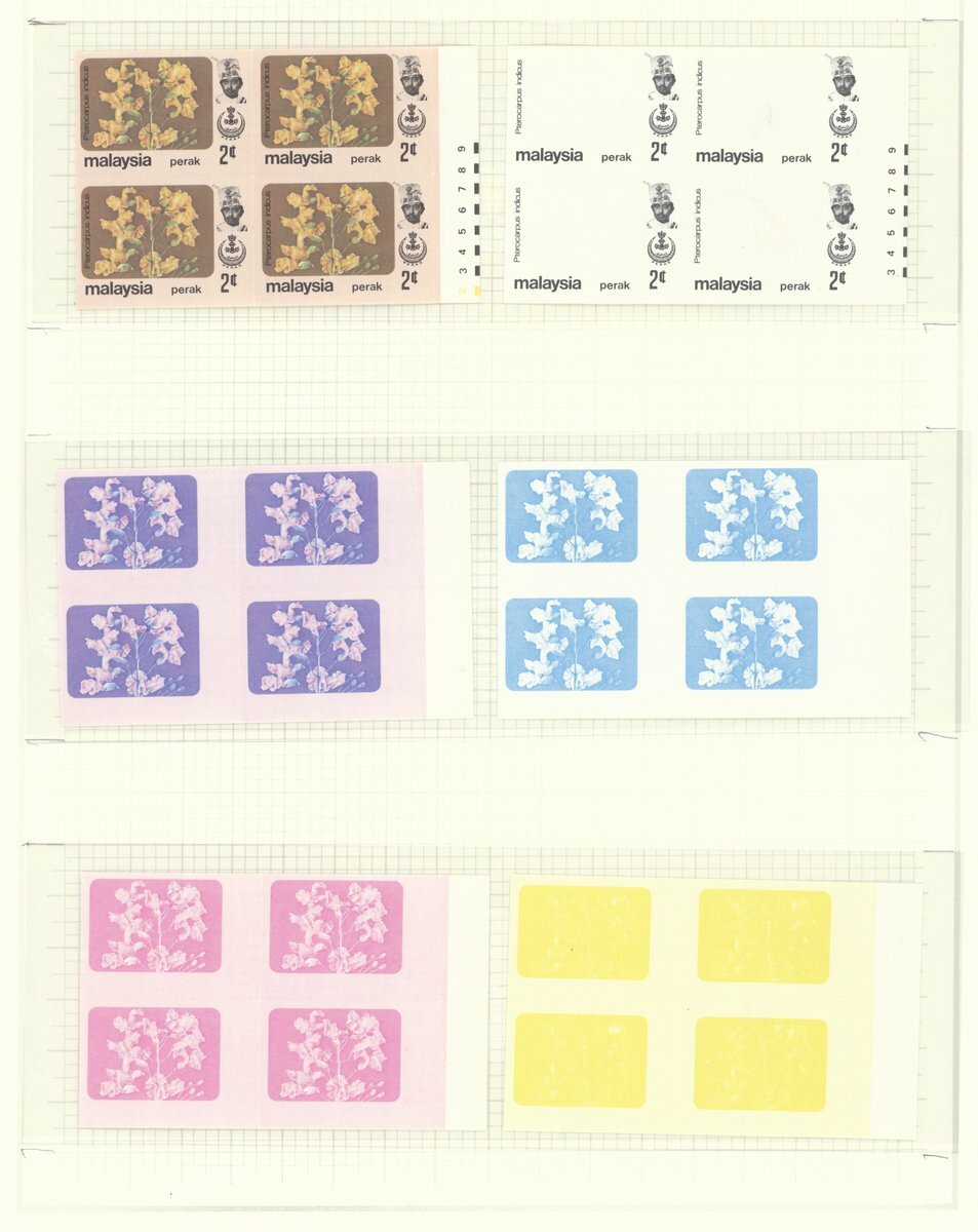 Johore 1c., 10c. and 15c., Kedah 1c., 2c. and 5c., Kelantan 20c., Malacca 10c. and 15c., Negri Sembilan 1c. and 5c., Pahang 2c., 10c. and 15c., Penang 20c., Perak 2c., 10c. and 15c., Perlis 1c., 5c., 20c. and 25c., Sabah 2c. and 5c., Sarawak 2c. and 10c., Selangor 1c. and 2c., and Trengganu 1c., 5c. and 10c., imperforate colour separations of each comprising cyan, yellow, magenta and cyan + magenta (except 15c. which has cyan + blue + magenta), black and as issued, each in a block of four, fine. (186 blocks)