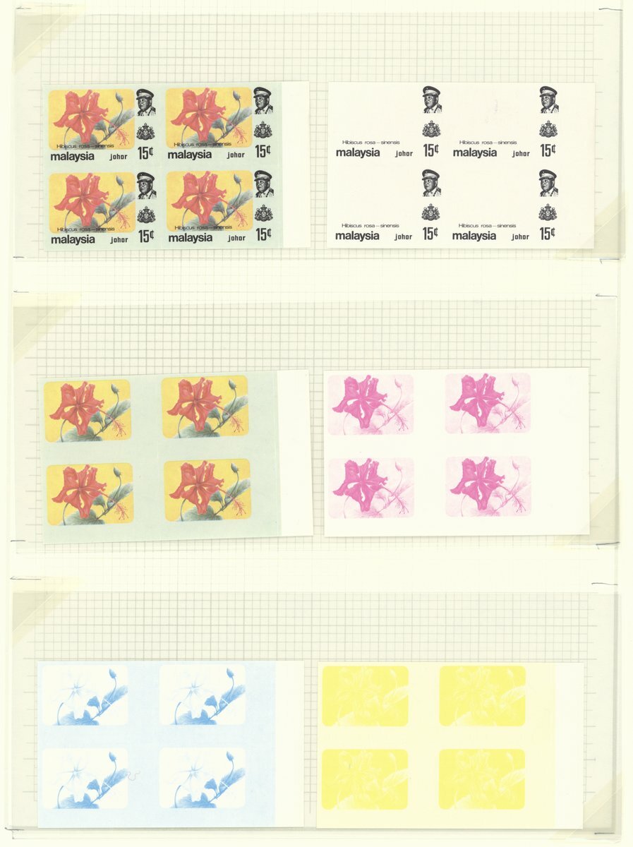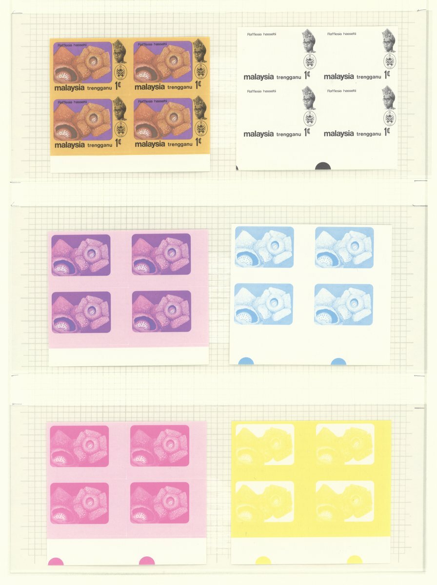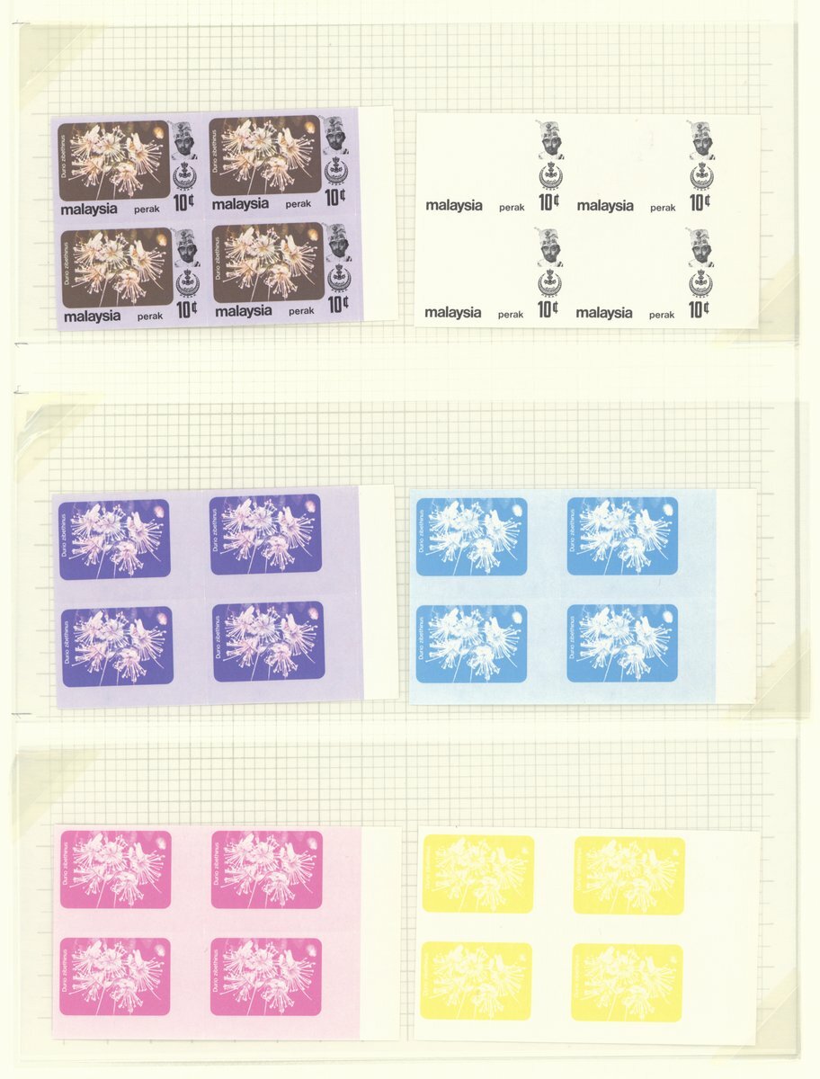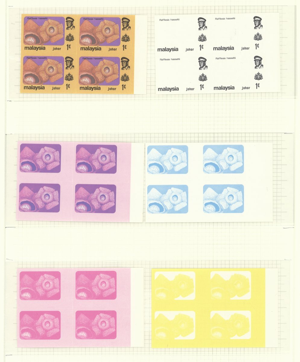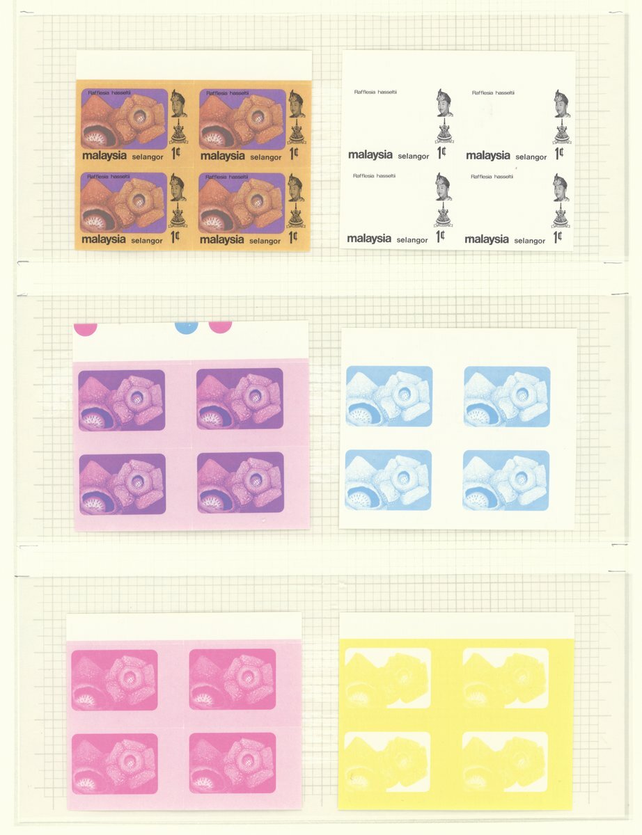 Johore 1c., 10c. and 15c., Kedah 1c., 2c. and 5c., Kelantan 20c., Malacca 10c. and 15c., Negri Sembilan 1c. and 5c., Pahang 2c., 10c. and 15c., Penang 20c., Perak 2c., 10c. and 15c., Perlis 1c., 5c., 20c. and 25c., Sabah 2c. and 5c., Sarawak 2c. and 10c., Selangor 1c. and 2c., and Trengganu 1c., 5c. and 10c., imperforate colour separations of each comprising cyan, yellow, magenta and cyan + magenta (except 15c. which has cyan + blue + magenta), black and as issued, each in a block of four, fine. (186 blocks)