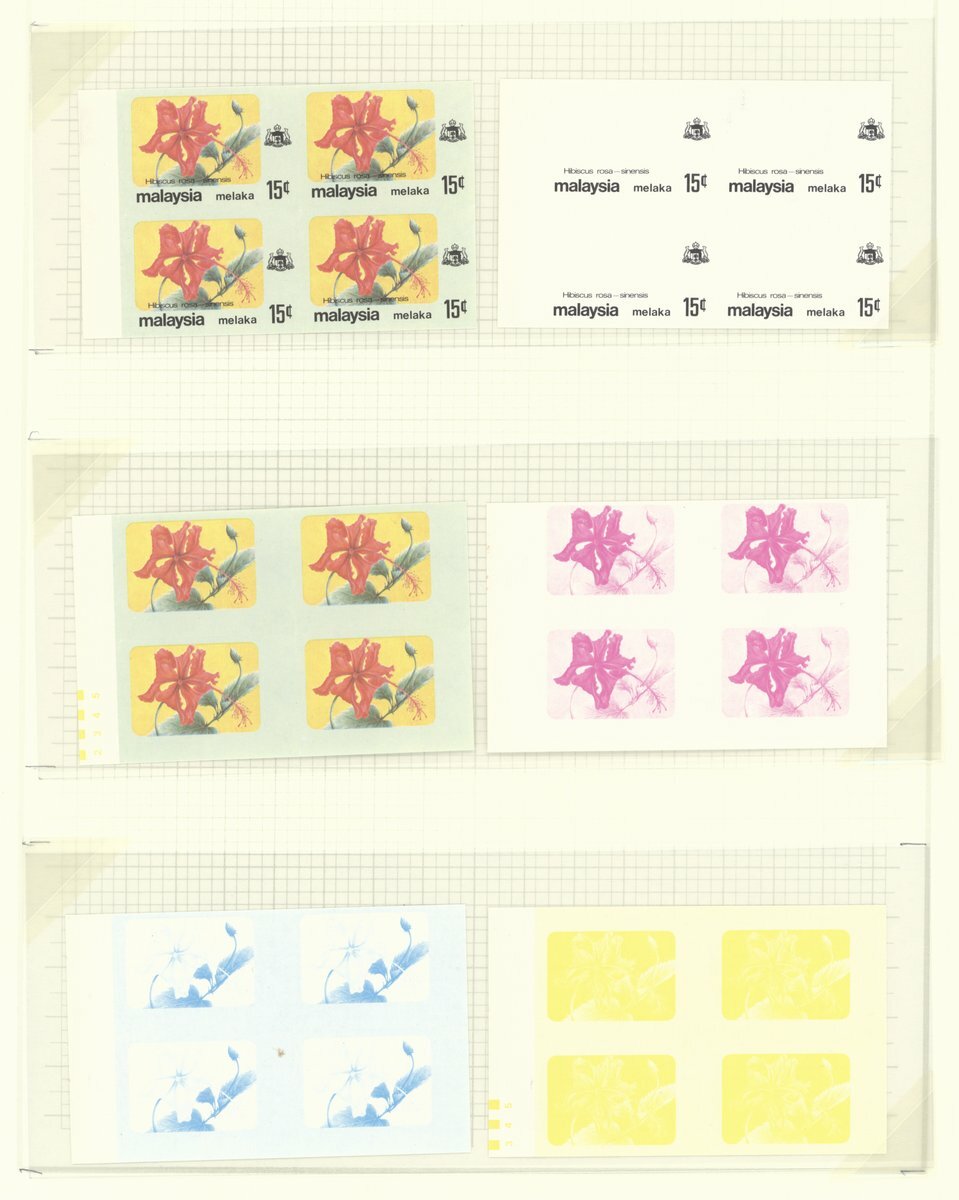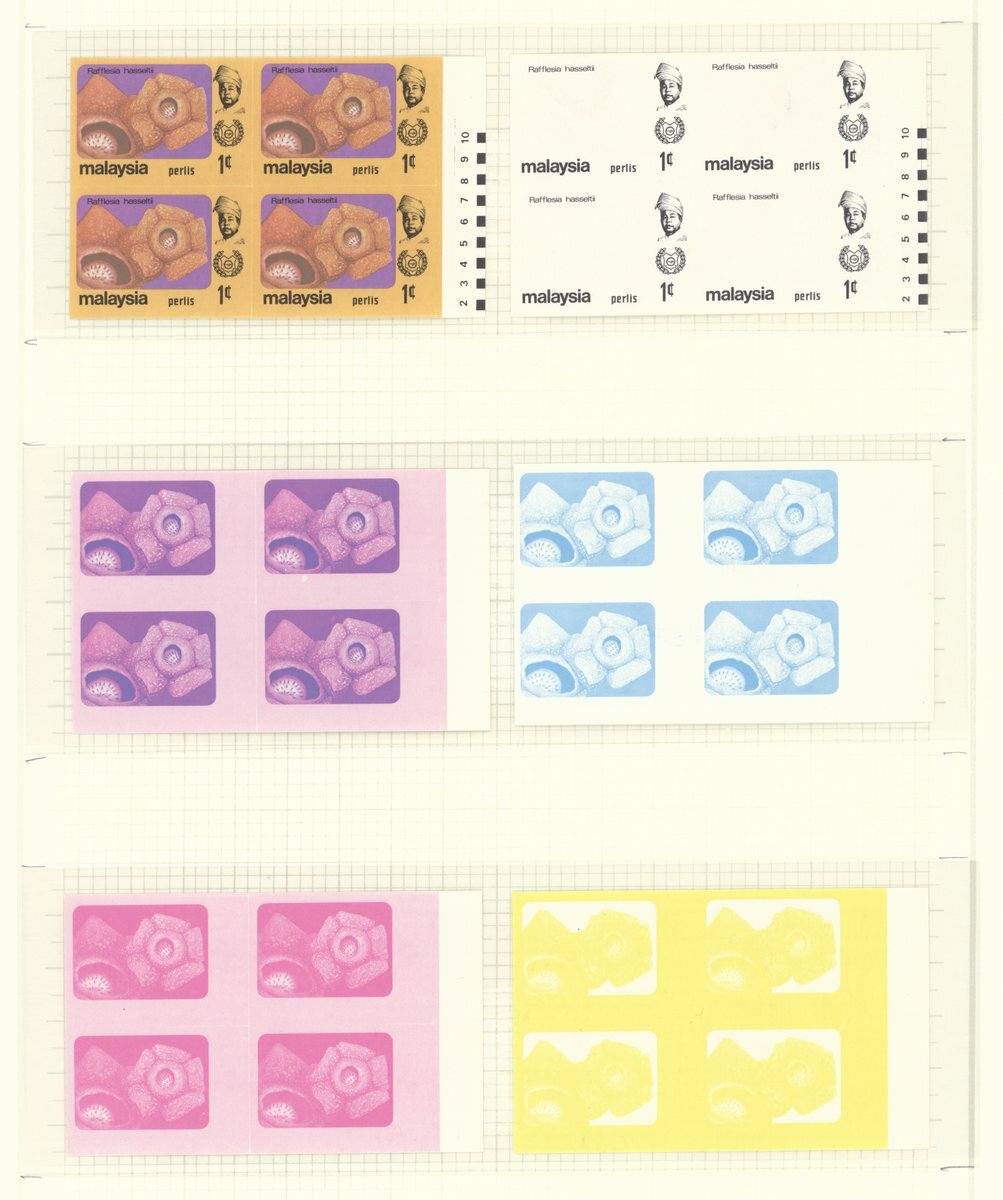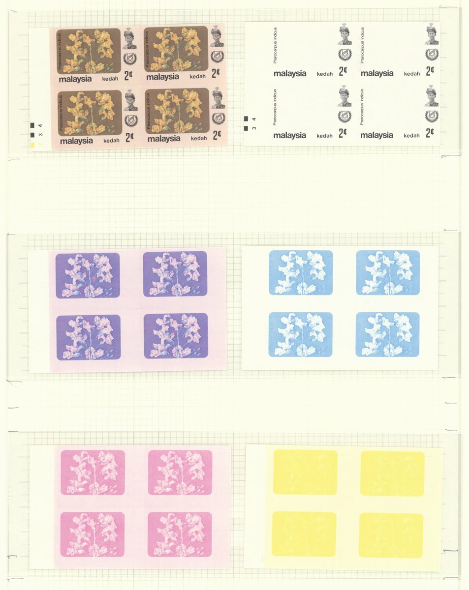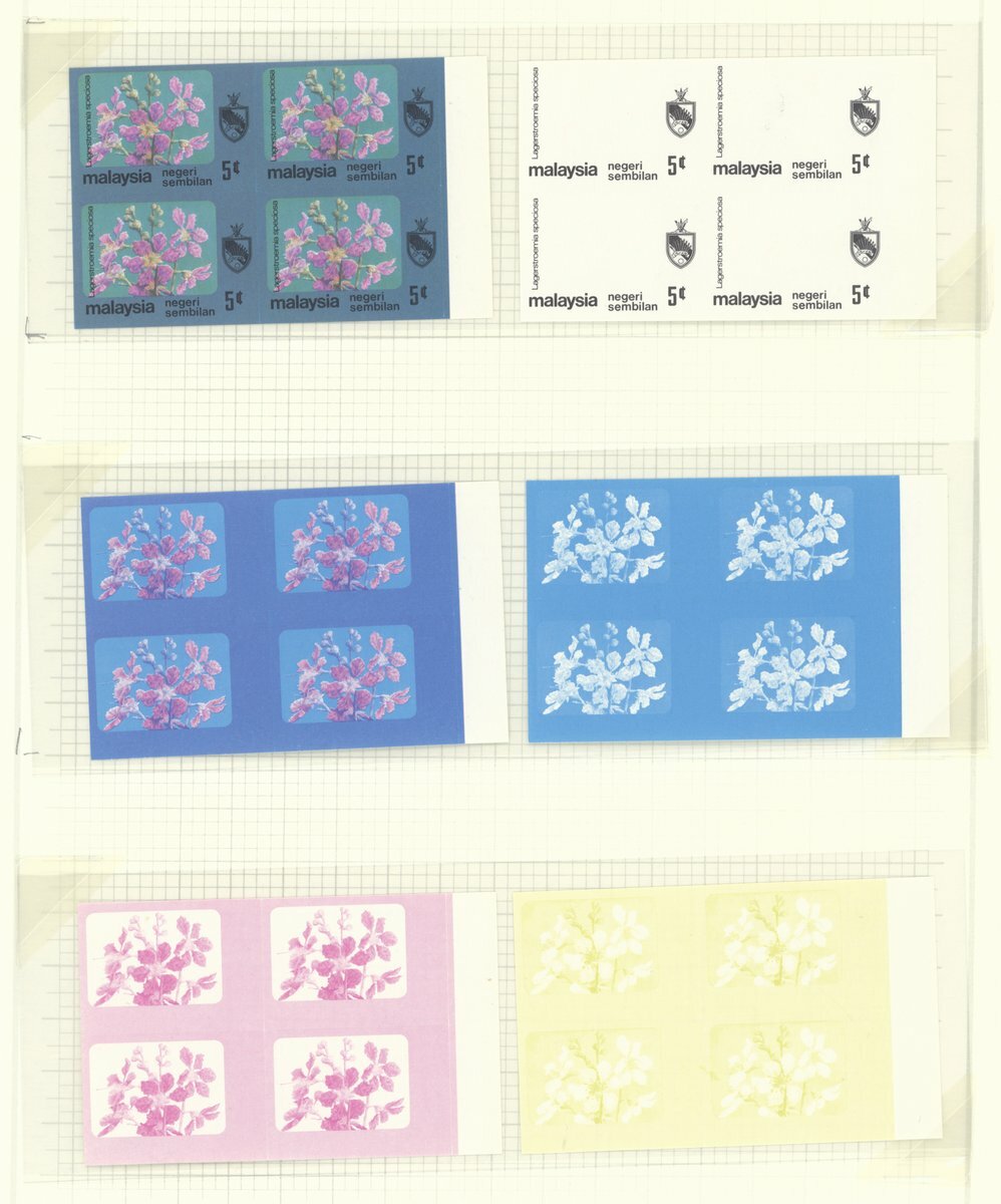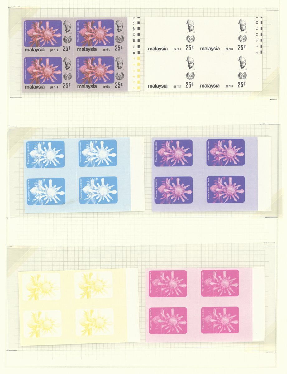 Johore 1c., 10c. and 15c., Kedah 1c., 2c. and 5c., Kelantan 20c., Malacca 10c. and 15c., Negri Sembilan 1c. and 5c., Pahang 2c., 10c. and 15c., Penang 20c., Perak 2c., 10c. and 15c., Perlis 1c., 5c., 20c. and 25c., Sabah 2c. and 5c., Sarawak 2c. and 10c., Selangor 1c. and 2c., and Trengganu 1c., 5c. and 10c., imperforate colour separations of each comprising cyan, yellow, magenta and cyan + magenta (except 15c. which has cyan + blue + magenta), black and as issued, each in a block of four, fine. (186 blocks)