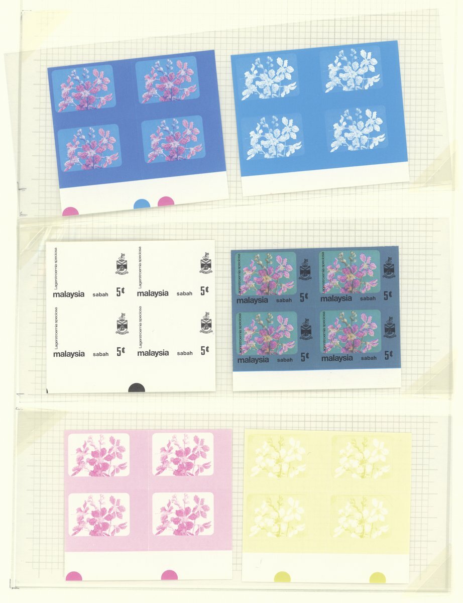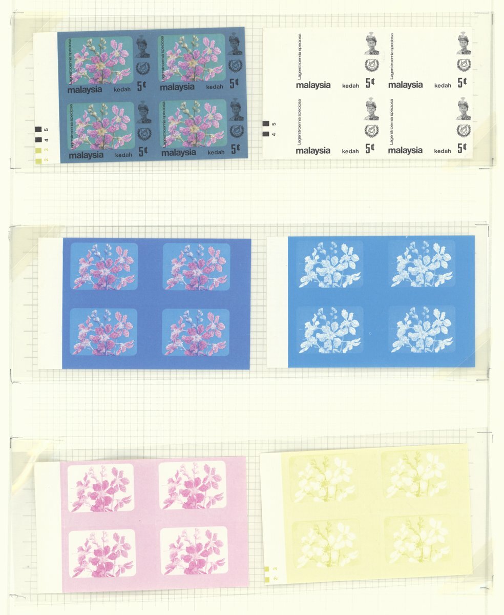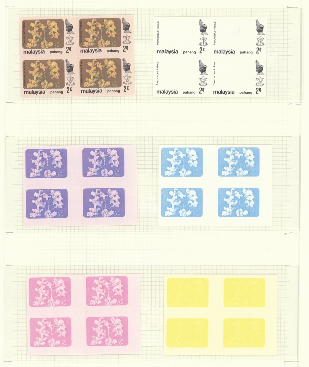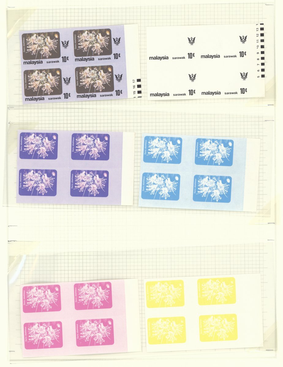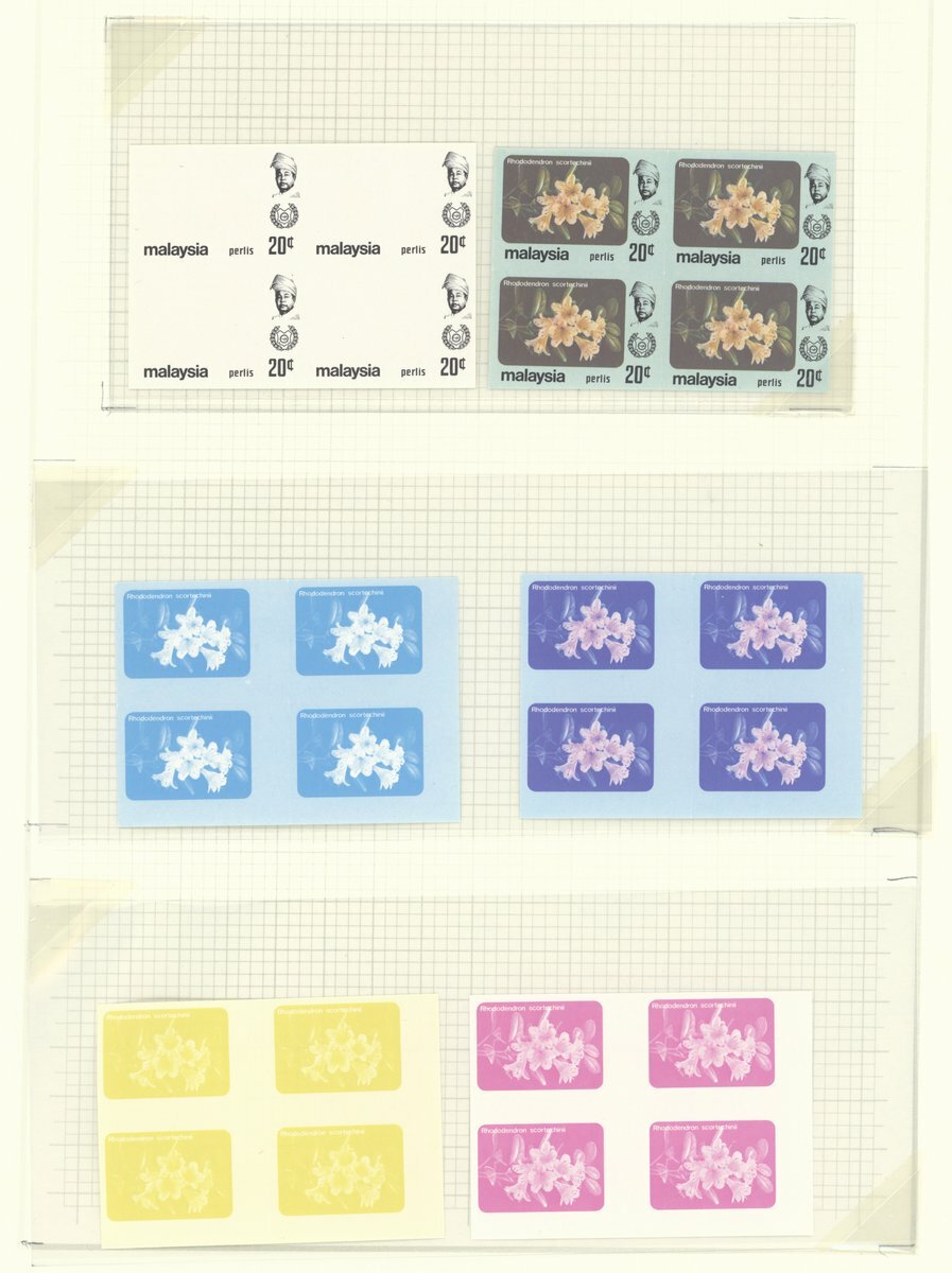 Johore 1c., 10c. and 15c., Kedah 1c., 2c. and 5c., Kelantan 20c., Malacca 10c. and 15c., Negri Sembilan 1c. and 5c., Pahang 2c., 10c. and 15c., Penang 20c., Perak 2c., 10c. and 15c., Perlis 1c., 5c., 20c. and 25c., Sabah 2c. and 5c., Sarawak 2c. and 10c., Selangor 1c. and 2c., and Trengganu 1c., 5c. and 10c., imperforate colour separations of each comprising cyan, yellow, magenta and cyan + magenta (except 15c. which has cyan + blue + magenta), black and as issued, each in a block of four, fine. (186 blocks)