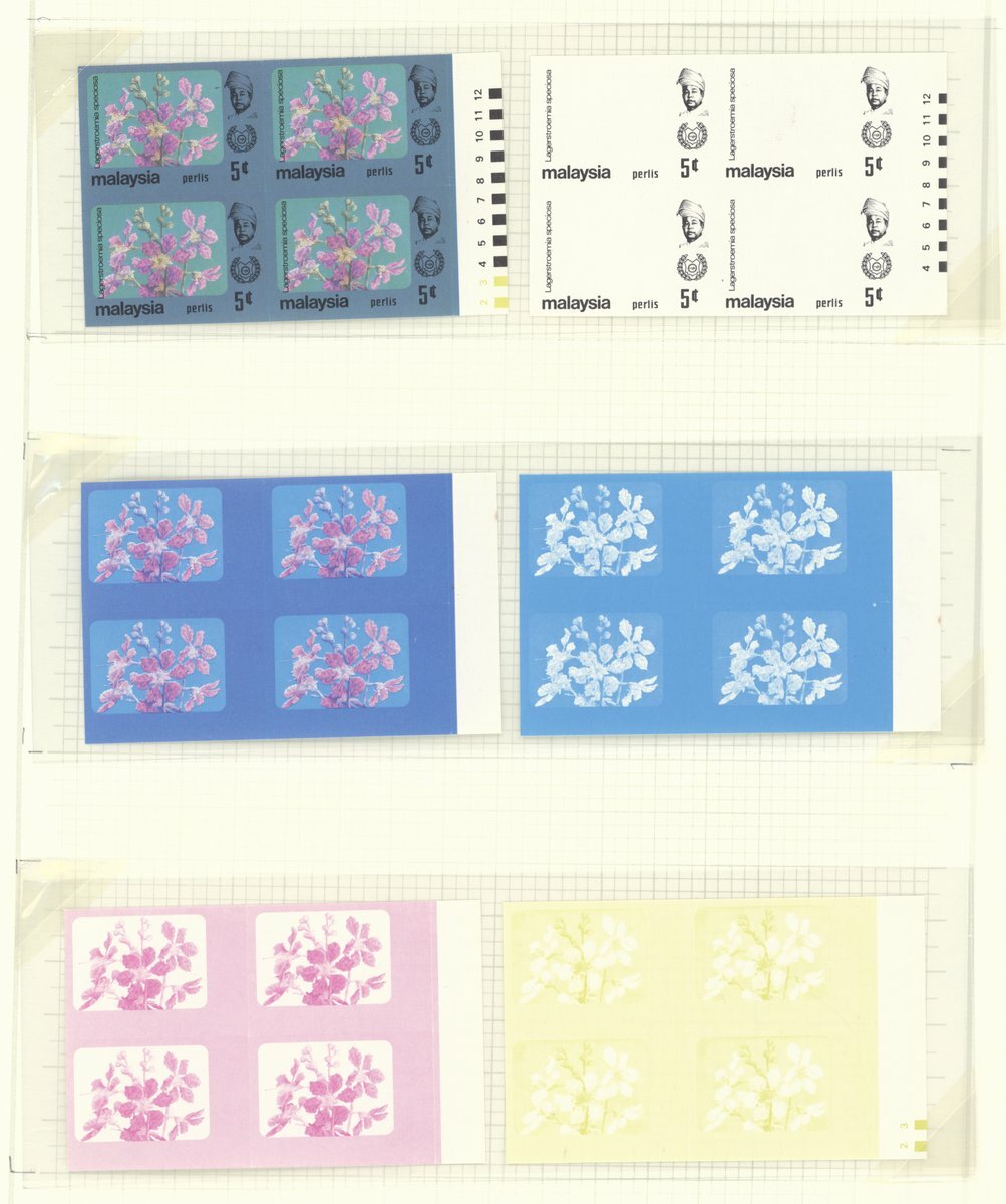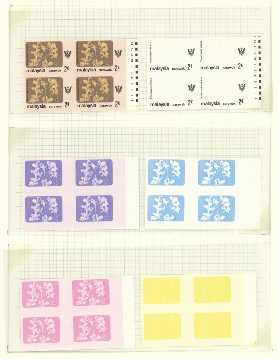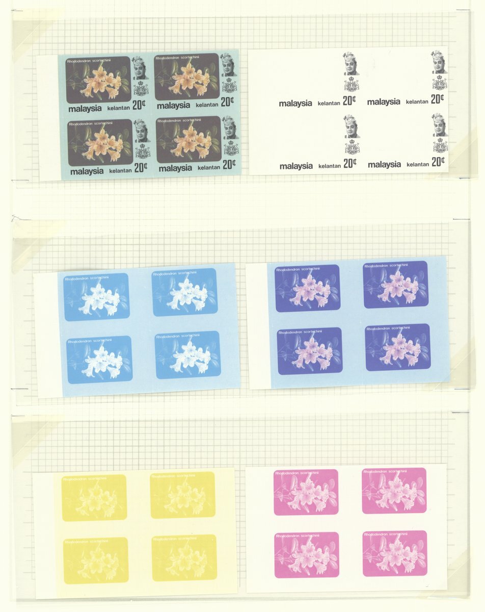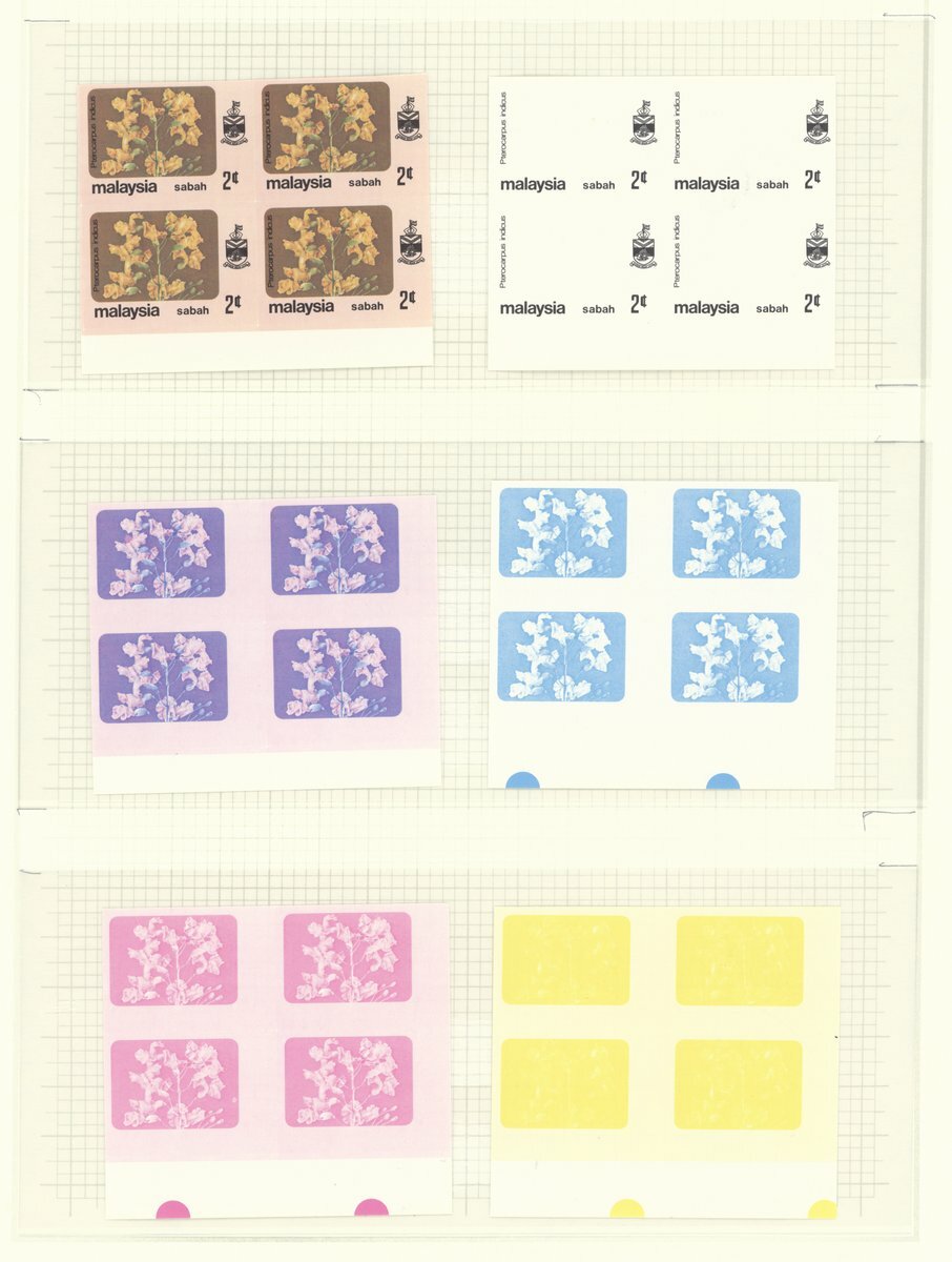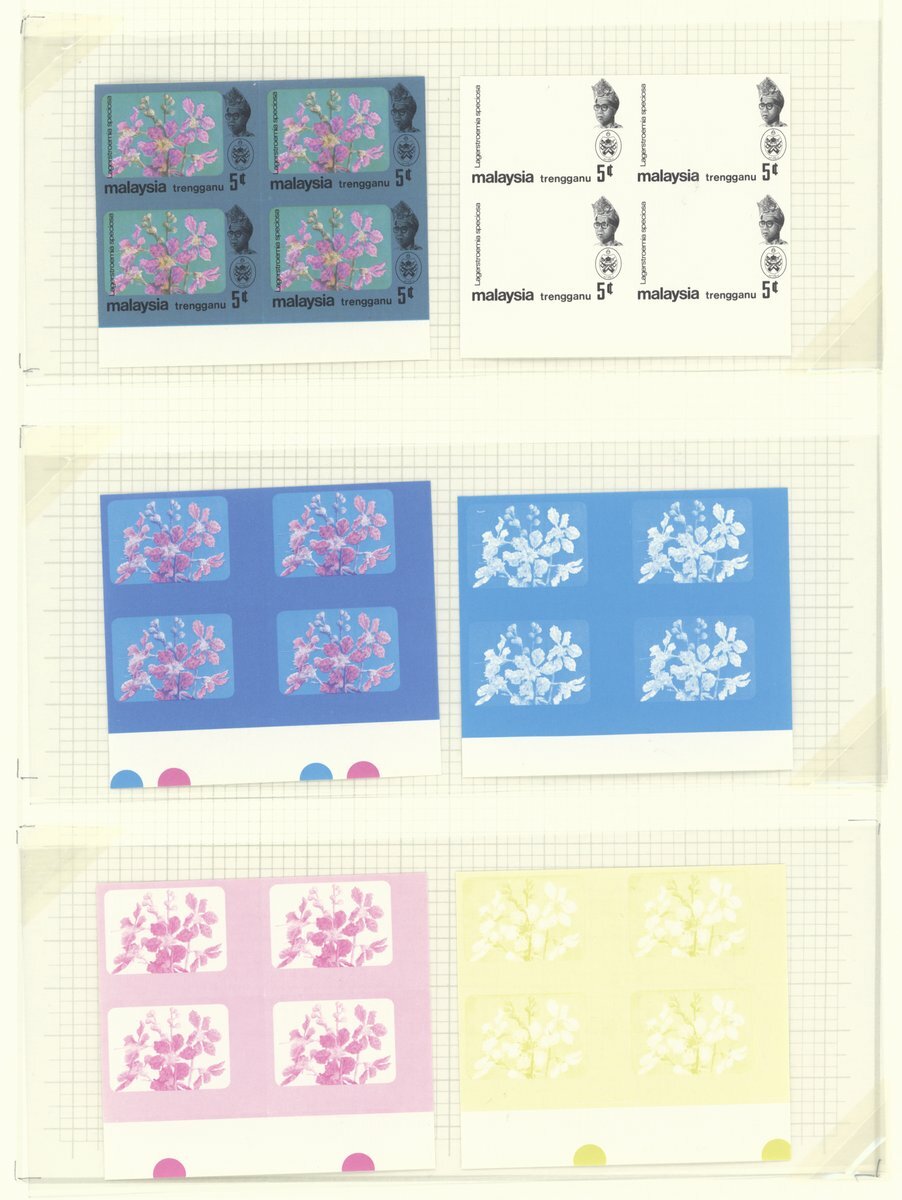 Johore 1c., 10c. and 15c., Kedah 1c., 2c. and 5c., Kelantan 20c., Malacca 10c. and 15c., Negri Sembilan 1c. and 5c., Pahang 2c., 10c. and 15c., Penang 20c., Perak 2c., 10c. and 15c., Perlis 1c., 5c., 20c. and 25c., Sabah 2c. and 5c., Sarawak 2c. and 10c., Selangor 1c. and 2c., and Trengganu 1c., 5c. and 10c., imperforate colour separations of each comprising cyan, yellow, magenta and cyan + magenta (except 15c. which has cyan + blue + magenta), black and as issued, each in a block of four, fine. (186 blocks)