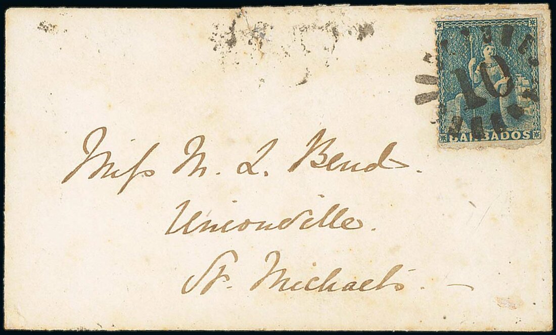 1871 (7 Mar.) small envelope from St. Peter to Miss Bend at St. Michael, bearing 1861-70 (1d.) blue cancelled with fine bootheel "10", the reverse (part flap missing) with complete "10" despatch datestamp across flap and another and small part datestamp; the sole local cover recorded with this bootheel cancellation. Also 1882 envelope from Bridgetown to Christchurch bearing 1882 ½d. pair with bootheel duplex and with very light "