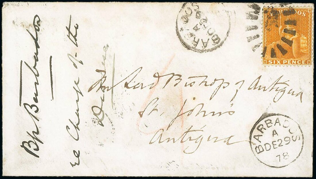 1878 (29 Dec.) envelope from Bishop's Court to the Lord Bishop of Antigua at St. John's, rated "4" and bearing 1876-81 perf. 14 6d. chrome-yellow cancelled with bootheel and showing two despatch datestamps alongside, arrival datestamp (3.1) on reverse; a rare franking with only two covers (this being the earlier) recorded bearing this 6d. value to this destination. Photo