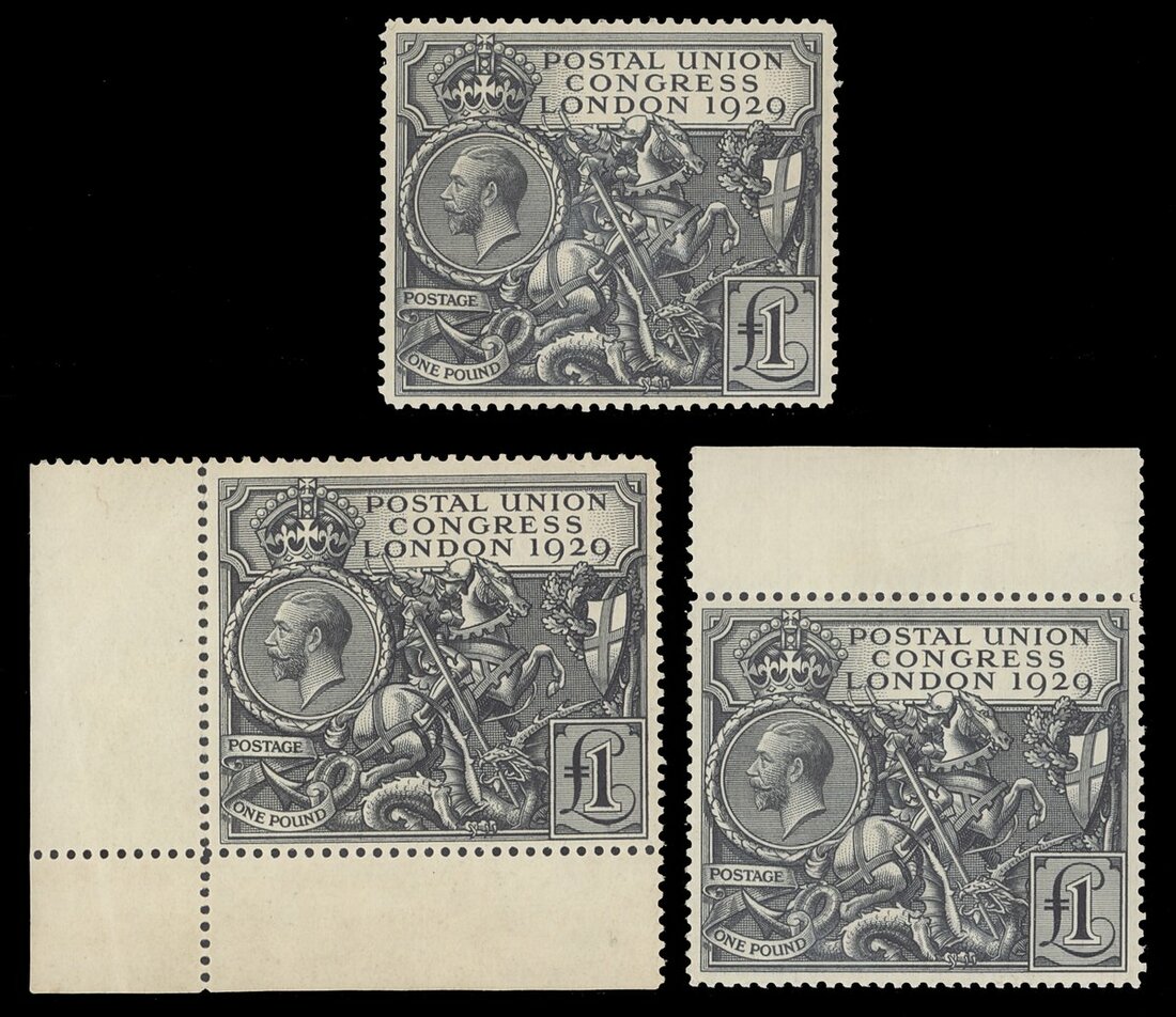 £1 black, part to large part original margin, three examples, one with top margins and one lower left corner margins; toned gum. (3)