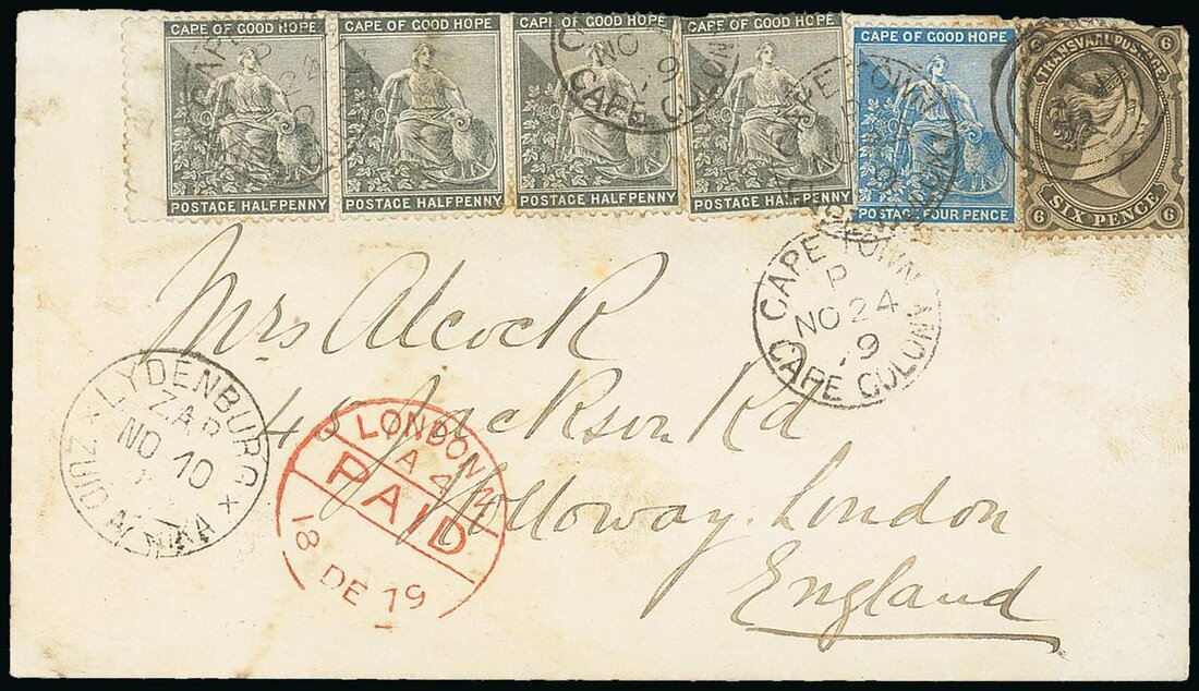 1879 (10 Nov.) envelope from Lydenburg to London, bearing 1878 6d. tied by "16" in concentric rings, in combination with Cape ½d. pair and singles (2) and 4d. cancelled by Cape Town c.d.s. (24.11), showing despatch and red arrival (18.12) datestamps; the adhesives with the odd minor tone and the 6d. and two ½d. singles with faults at top. Photo
