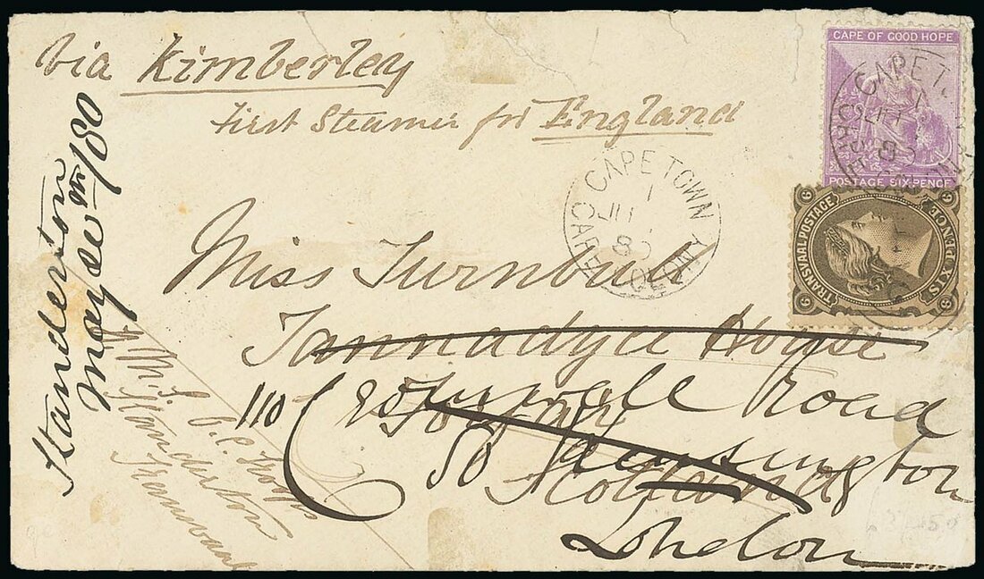 1880 (May) envelope from the Commanding Officer of troops at Sanderton to London and redirected to Scotland, marked "Via Kimberley", bearing 1878 6d. tied by light concentric ring obliterator, in combination with 6d. tied by Cape Town c.d.s. with another strike alongside and showing arrival datestamps on reverse. Photo