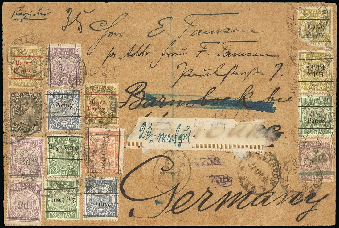 1899 (22 Apr.) Tamsen envelope (193x130mm.) registered from Nylstroom, bearing 1878 6d., 1885 (May) ½d. on 3d., 1885 (Sept.) ½d. on 3d., 1893 ½d. on 2d. (4, two with red surcharge), 1d. on 6d. (2), 2½d. (Type 27) on 1/- (2) and 2½d. (Type 28) on 1/- and 1895 1d. on 2½d., all tied by c.d.s. and showing, on reverse, Pretoria and arrival datestamps. A remarkable franking. Photo